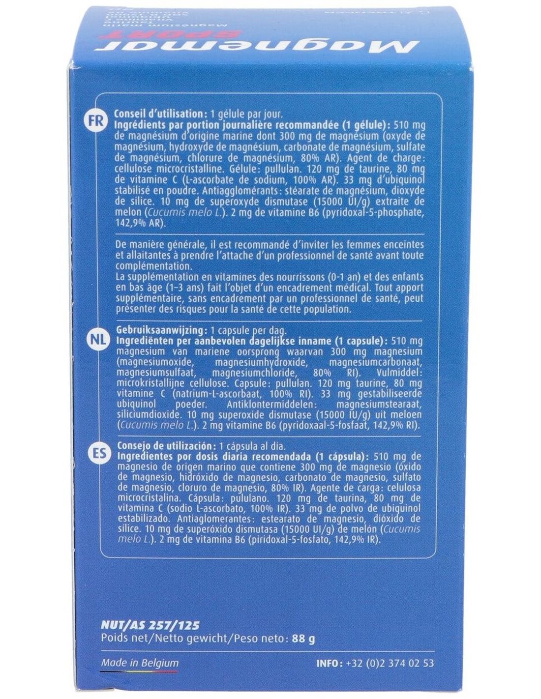 510mg de Magnesio de origen marino que contiene 300mg de magnesio (óxido de magnesio, hidróxido de magnesio, carbonato de magnesio, sulfato de magnesio, cloruro de magnesio, 80% IR), 120mg de Taurina, 80mg de Vitamina C (sodio L-ascorbato, 100% IR), 33mg de Polvo de ubiquinol estabilizado, 10mg de Superóxido dismutasa (15000 UI/g) de melón (Cucumis melo L.), 2mg de Vitamina B6 (clorhidrato de piridoxina, 142,9% IR).