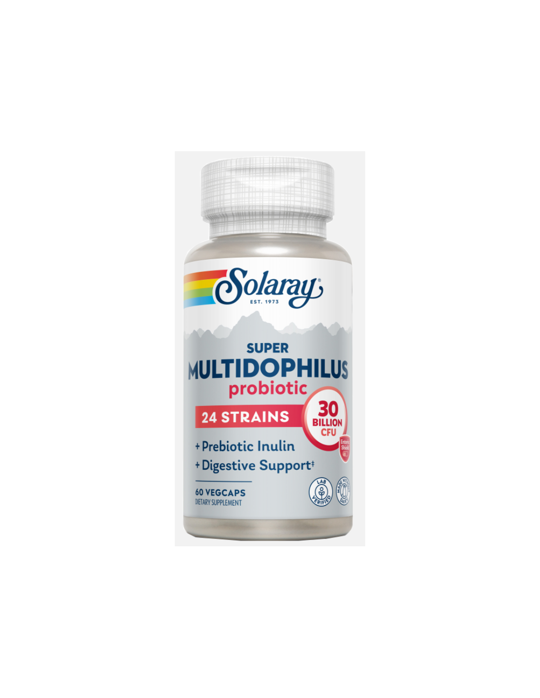 Super Multidophilus 24-60 Vegcaps de SOLARAY es un suplemento probiótico diseñado para apoyar la salud digestiva y el equilibrio natural de la flora intestinal. Cada cápsula contiene una combinación de 24 cepas diferentes de bacterias beneficiosas, protegidas con recubrimiento entérico para asegurar su llegada intacta al intestino. Ideal para quienes buscan mejorar su bienestar digestivo y fortalecer el sistema inmunológico de forma natural. Presentado en cápsulas vegetales, es una opción adecuada para dietas vegetarianas y veganas.
