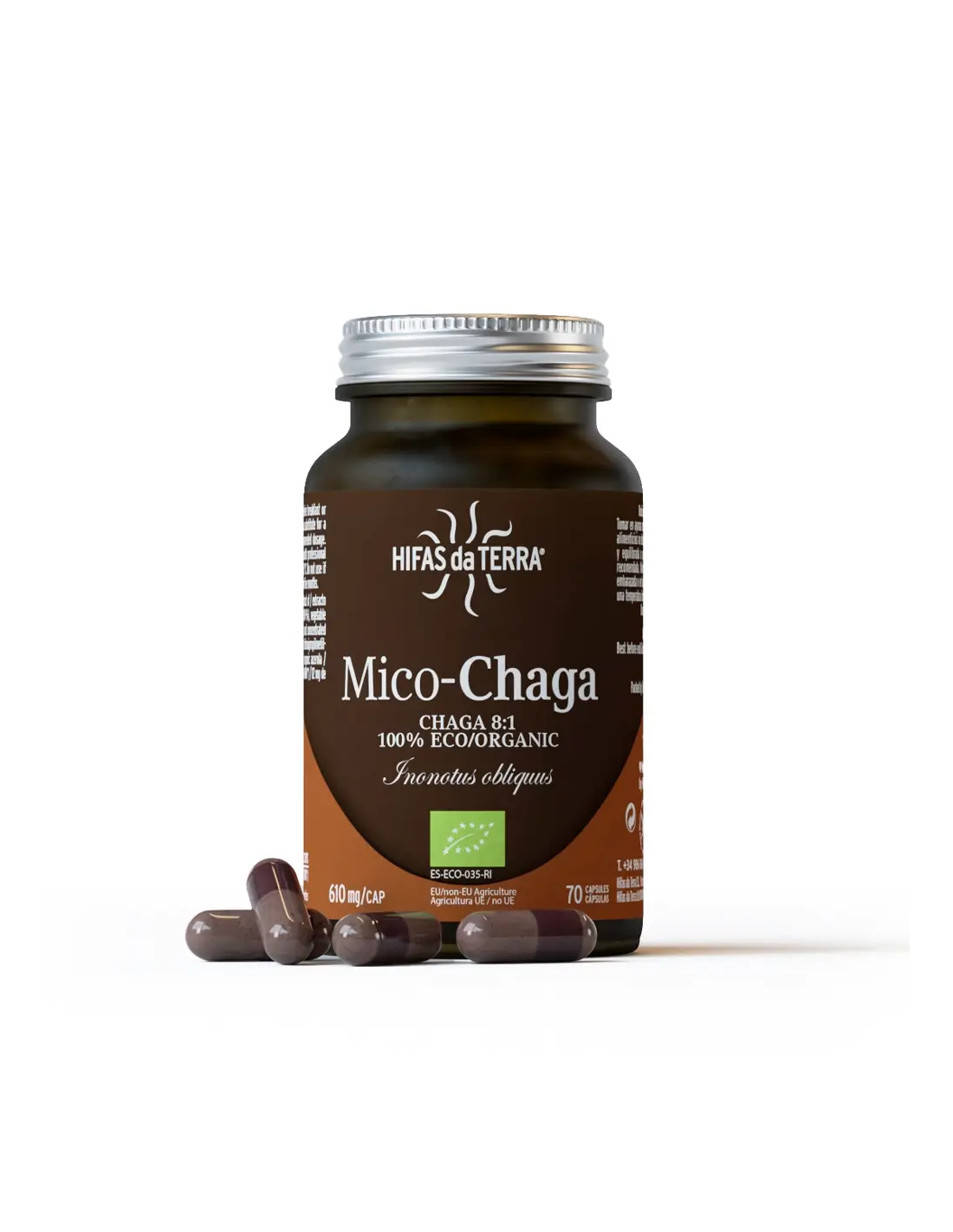 HIFAS DA TERRAMico-Chaga es el complemento alimenticio de cápsulas vegetales con extracto puro y ecológico de la perla del norte, Chaga (Inonotus obliquus). Contiene vitamina C proveniente de la acerola que ayuda a proteger a las células del daño oxidativo. Apto para celíacos, intolerantes a la lactosa, vegetarianos y veganos. Los productos de Hifa da Terra no contienen metales pesados ni pesticidas.