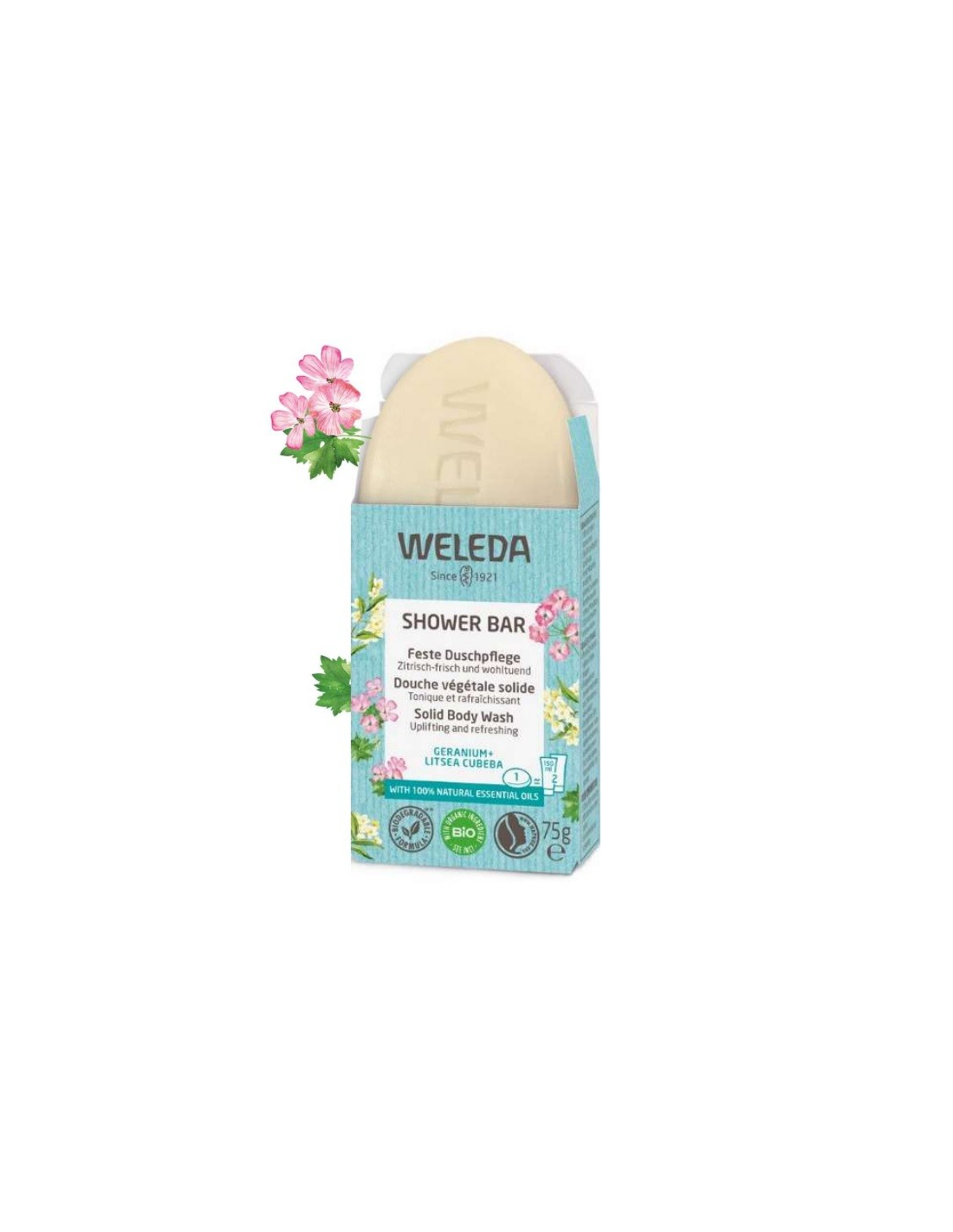Jabón de ducha sólido, concentrado. 100% biodegradable. Fragancia refrescante con geranio y litsea cubeba y manteca de karité orgánica. Producto vegano.