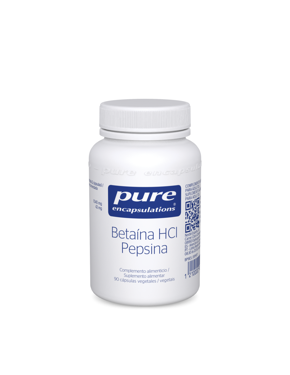 Ingredientes:Hidrocloruro de betaína, agente de recubrimiento (hidroxipropilmetilcelulosa), agente de carga (celulosa), pepsina porcina, antioxidante (palmitato de ascorbilo).Modo de empleo:Tomar 1 cápsula dos veces al día con las comidas.Presentación:Envase de 90 cápsulas.Recomendaciones y advertencias:No contiene: Grasas hidrogenadas, cacahuetes y otros frutos secos, edulcorantes ni colorantes artificiales, dióxido de titanio, aromas artificiales ni gluten.