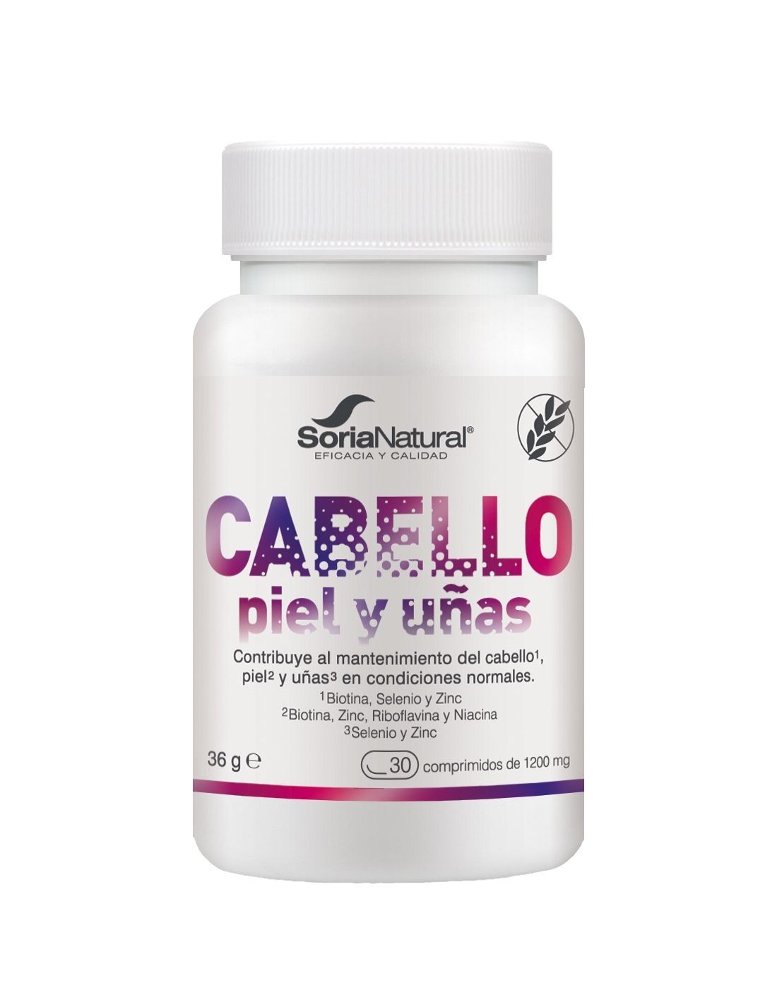CABELLO, PIEL Y UÑAS es una eficaz combinación de vitaminas, minerales y aminoácidos que aporta al organismo los componentes necesarios para el cabello, piel y uñas. La biotina, el selenio y el zinc contribuyen a mantener el cabello en condiciones normales. La biotina, el zinc, la riboflavina y la niacina ayudan a mantener la piel en condiciones normales. El selenio y el zinc contribuyen a mantener las uñas en condiciones normales. Su presentación en forma de comprimidos de liberación sostenida, se favorece que los principios activos se liberen del cuerpo a una velocidad controlada y sostenida, para un mejor aprovechamiento de los mismos. Producto sin gluten.
