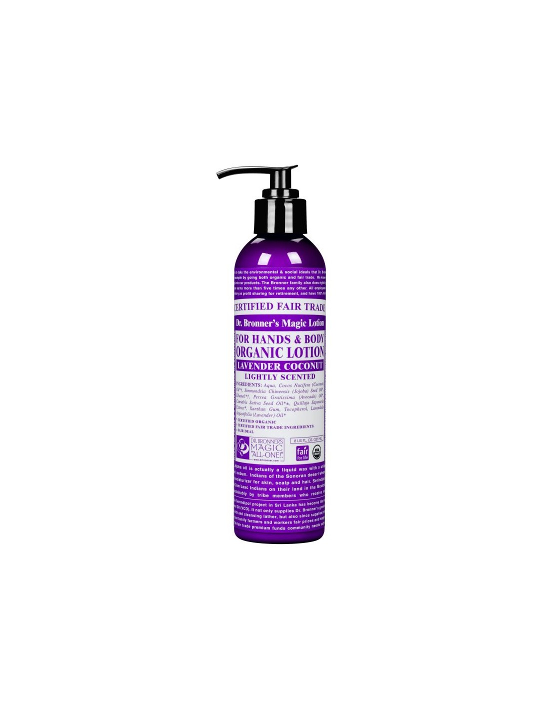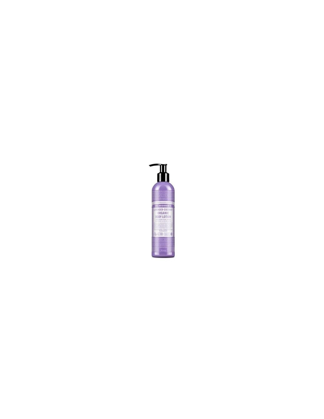 La Loción Corporal Lavanda-Coco de Dr Bronners es un cuidado hidratante para pieles sensibles, que ofrece suavidad y frescura gracias a su fórmula con ingredientes naturales de lavanda y coco.