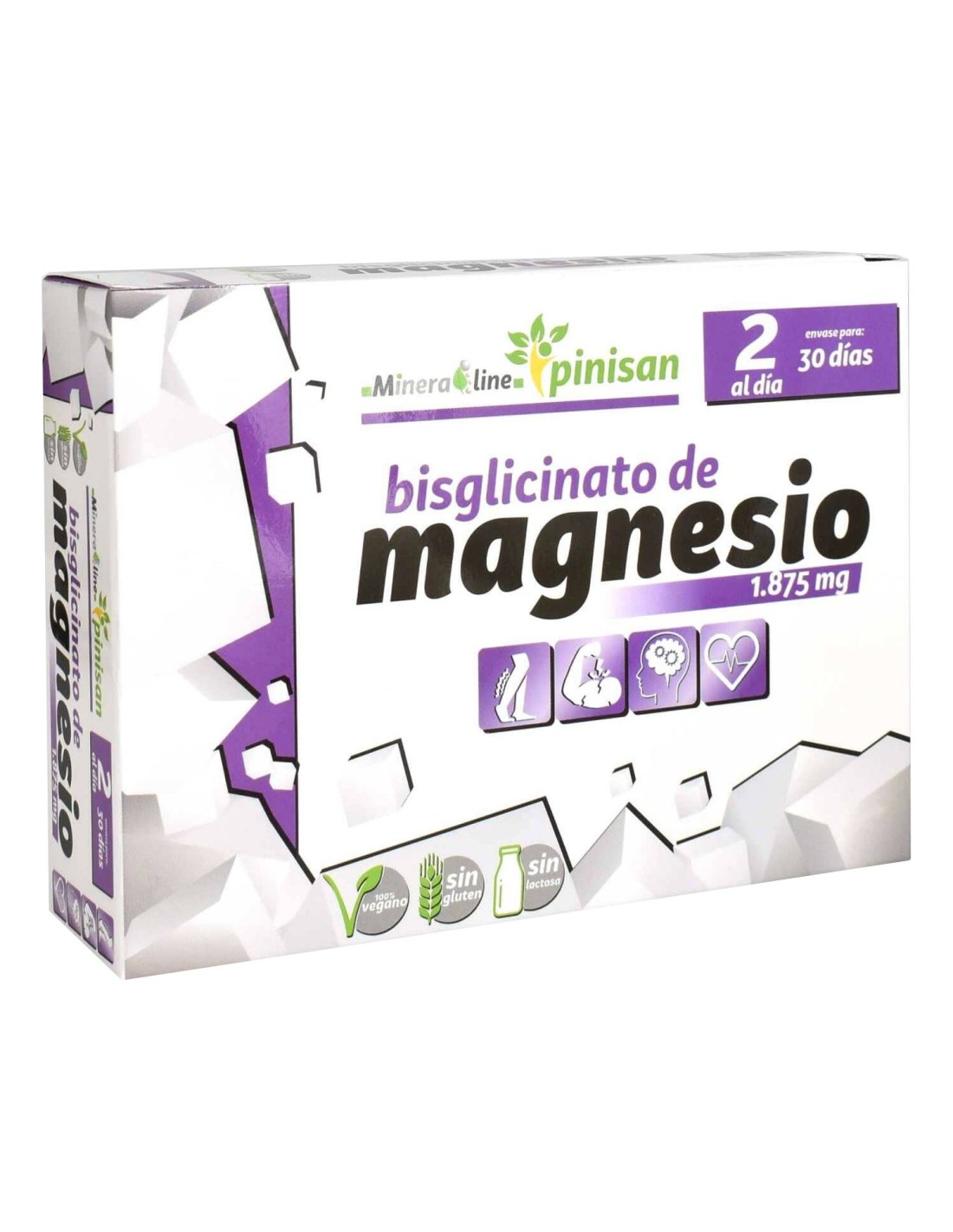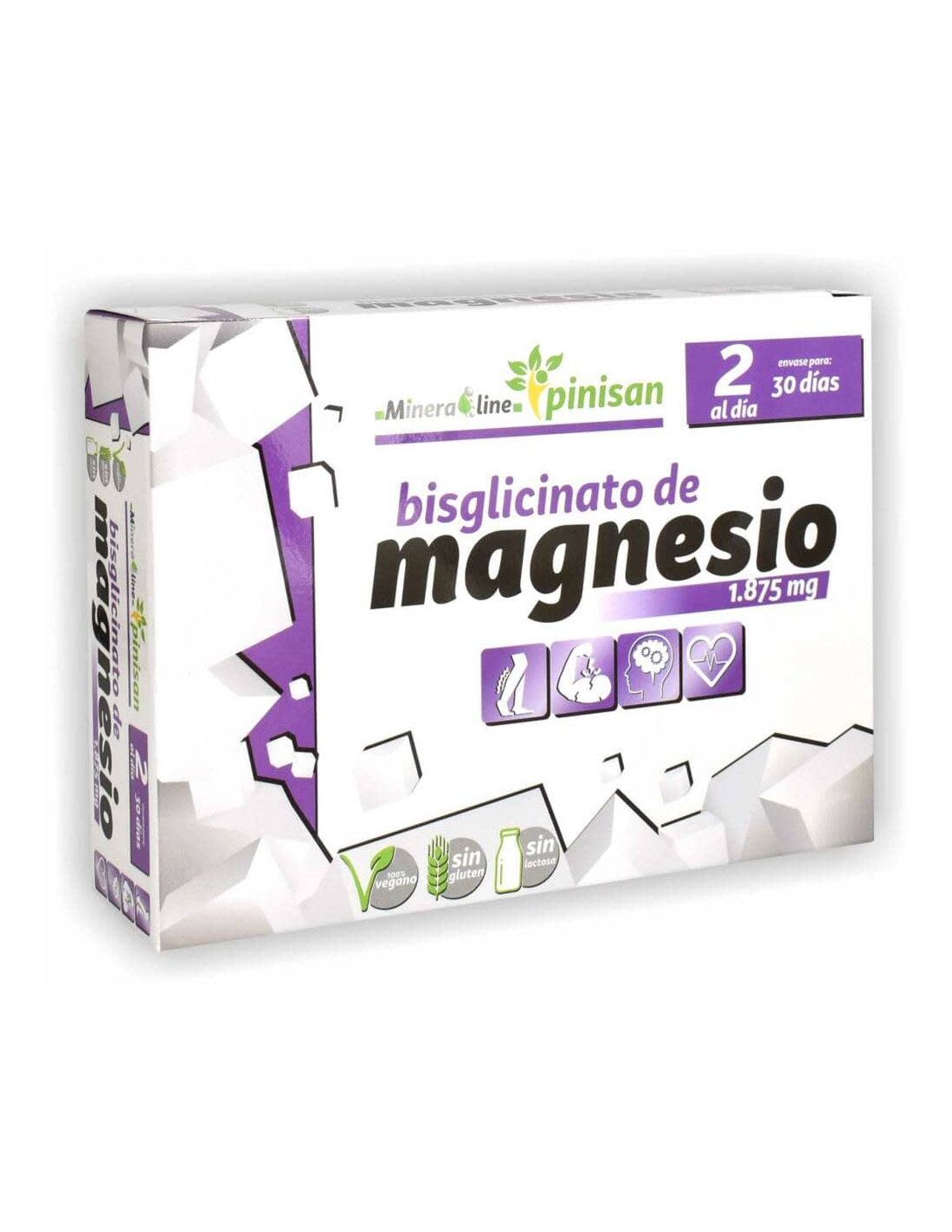 Complemento alimenticio a base de magnesio. El magnesio ayuda a disminuir el cansancio y la fatiga. Contribuye al equilibrio electrolítico, al metabolismo energético normal y al normal funcionamiento del sistema nervioso y los músculos, así como al mantenimiento de los huesos y dientes en condiciones normales. El Bisglicinato de Magnesio es un compuesto orgánico de magnesio basado en la combinación de un átomo de magnesio y dos moléculas del aminoácido glicina, lo que da como resultado un compuesto orgánico que mejora la absorción y biodisponibilidad del magnesio en el organismo. Producto 100% vegano, sin gluten ni lactosa.