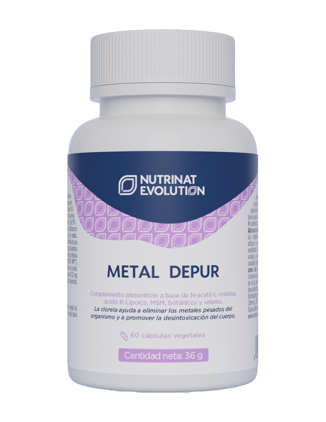 Metal Depur® de Nutrinat Evolution es una combinación sinérgica de plantas, aminoácidos azufrados y selenio, que contribuyen a la eliminación de elementos tóxicos, en particular de los metales pesados.Metal Depur® contiene una combinación única y sinérgica de ingredientes que van a favorecer la eliminación de los metales pesados del organismo, van a neutralizar sus efectos nocivos gracias al efecto antioxidante y van a fortalecer el sistema inmunológico.Aplicaciones potenciales: