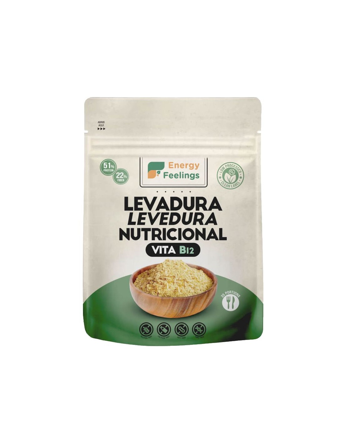 La levadura nutricional con vitamina B12 de Energy Feelings es un súper alimento que enriquece el valor nutritivo de cualquier preparación, siendo un producto elaborado ex profeso para la alimentación humana (a diferencia de la más comúnmente comercializada levadura de cerveza), sin los residuos potencialmente tóxicos de la industria cervecera.La levadura nutricional de Energy Feelings es cuidadosamente cultivada a partir de una cepa de la levadura primaria Saccharomyces cerevisiae en melazas purificadas de remolacha. Más tarde es inactivada y secada en un tambor de rodillos que la convierte en escamas homogéneas. Esta levadura no genera el desarrollo de levaduras en el intestino por ser inactiva, teniendo un delicioso sabor ligeramente salado, no amargante (a diferencia de la levadura de cerveza tradicional). Se presenta en forma de escamas de un color pardo claro con variadas posibilidades de uso.La levadura nutricional con vitamina B12 de Energy Feelings es también una gran fuente de Zinc, (con un 120% del valor referencia nutricional en tan solo 10 g de producto). El zinc es un oligoelemento muy importante para la salud (siendo necesario para el correcto funcionamiento del sistema inmunitario, la división y crecimiento celular y el metabolismo de los carbohidratos).Propiedades: