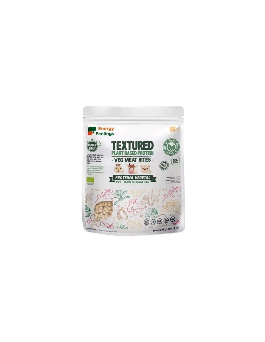La Proteína Vegetal Texturizada (PVT) Tacos de carne Vegetales de Energy Feelings tiene un 53% de proteína, por lo que una ración de 50 g proporciona 26 g de proteína (en un bistec hay 10 g y en dos huevos 15 g). Por tanto, aporta una cantidad excepcional de proteínas y nutrientes en su forma biodisponible. Elevado contenido de vitaminas y minerales esenciales, así como de proteínas completas. alternativa vegetal a la carne e ideal para combinar en todas vuestras recetas. Una opción de proteína absolutamente simple, suave y neutra.La Proteína Vegetal Texturizada (PVT) Tacos de carne Vegetales de Energy Feelings es idónea para disfrutar de una comida extremadamente saludable, de una forma rápida y sencilla. Además, son muy sabrosas, ya que con distintas combinaciones obtenemos un gran número de recetas.La Proteína Vegetal Texturizada (PVT) Tacos de carne Vegetales de Energy Feelings es una fantástica alternativa a la proteína animal o incluso mejor que los productos de soja altamente procesados. Es mucho más sostenible, tiene un proceso de producción sencillo y libre de químicos y se cocina rápido, recomendado para todas las edades y todos los géneros.Ingredientes:Proteína de guisante*, proteína de haba* y sal (*) Procedente de cultivo ecológico.Modo de empleo:1. Por ración (30-50 g), rehidrata la (PVT) agregando 2 tazas (50 g) de Texturizado Tacos de carne Veg en 1 taza de agua caliente (200 ml) con una cucharadita de sal durante 15 minutos.