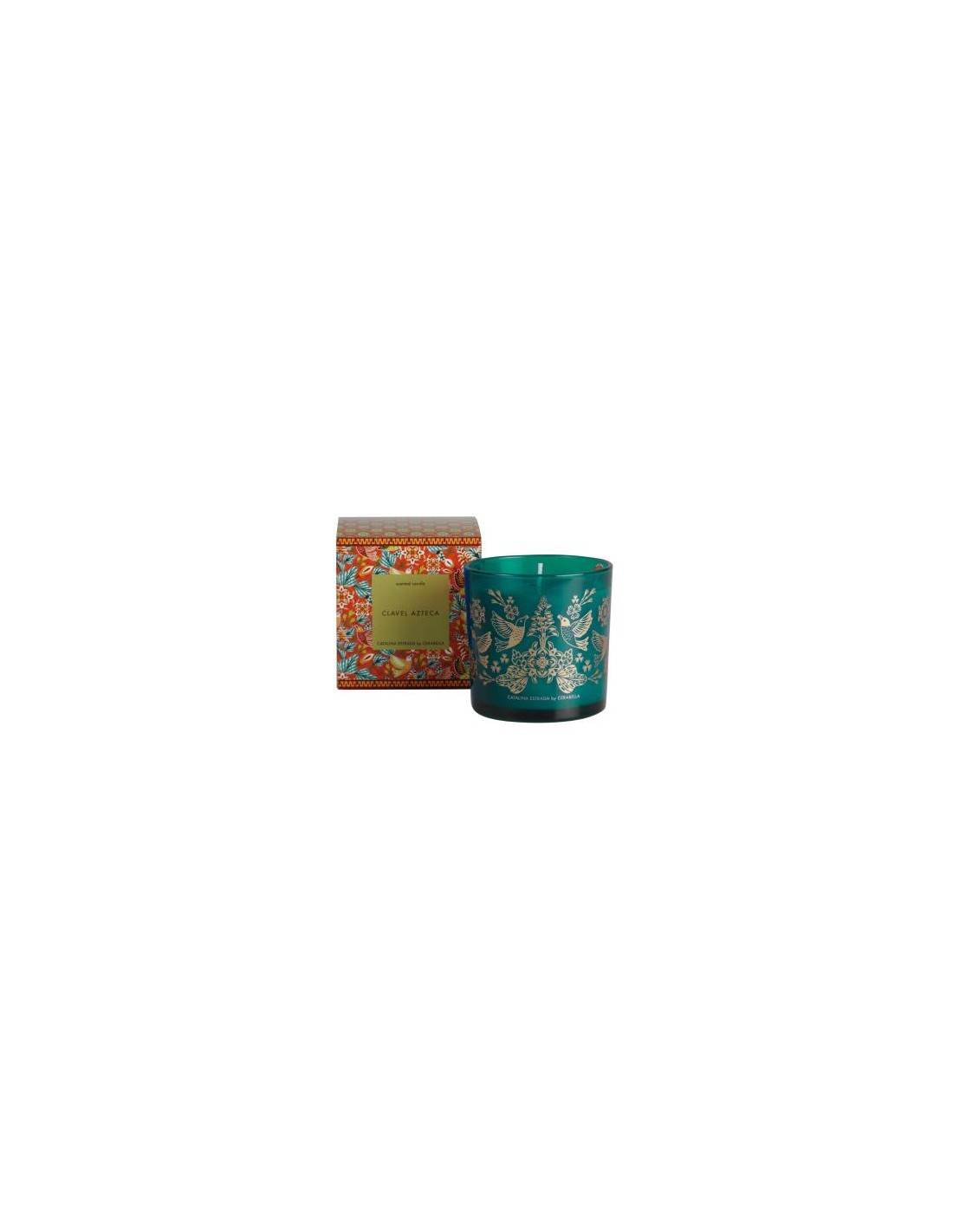 Vela perfumada en recipiente de cristal tintado y serigrafía en oro con ilustraciones originales de la artista Catalina Estrada, ilustradora Colombiana. La esencia de sus diseños se centra en el ritmo, la armonía y el color. Este modelo se encuentra envuelto en una fragancia refrescante y exótica con una salida de bergamota que da paso a un corazón balsámico de elemí e incienso sobre una base suavemente amaderada de pachulí y cedro.