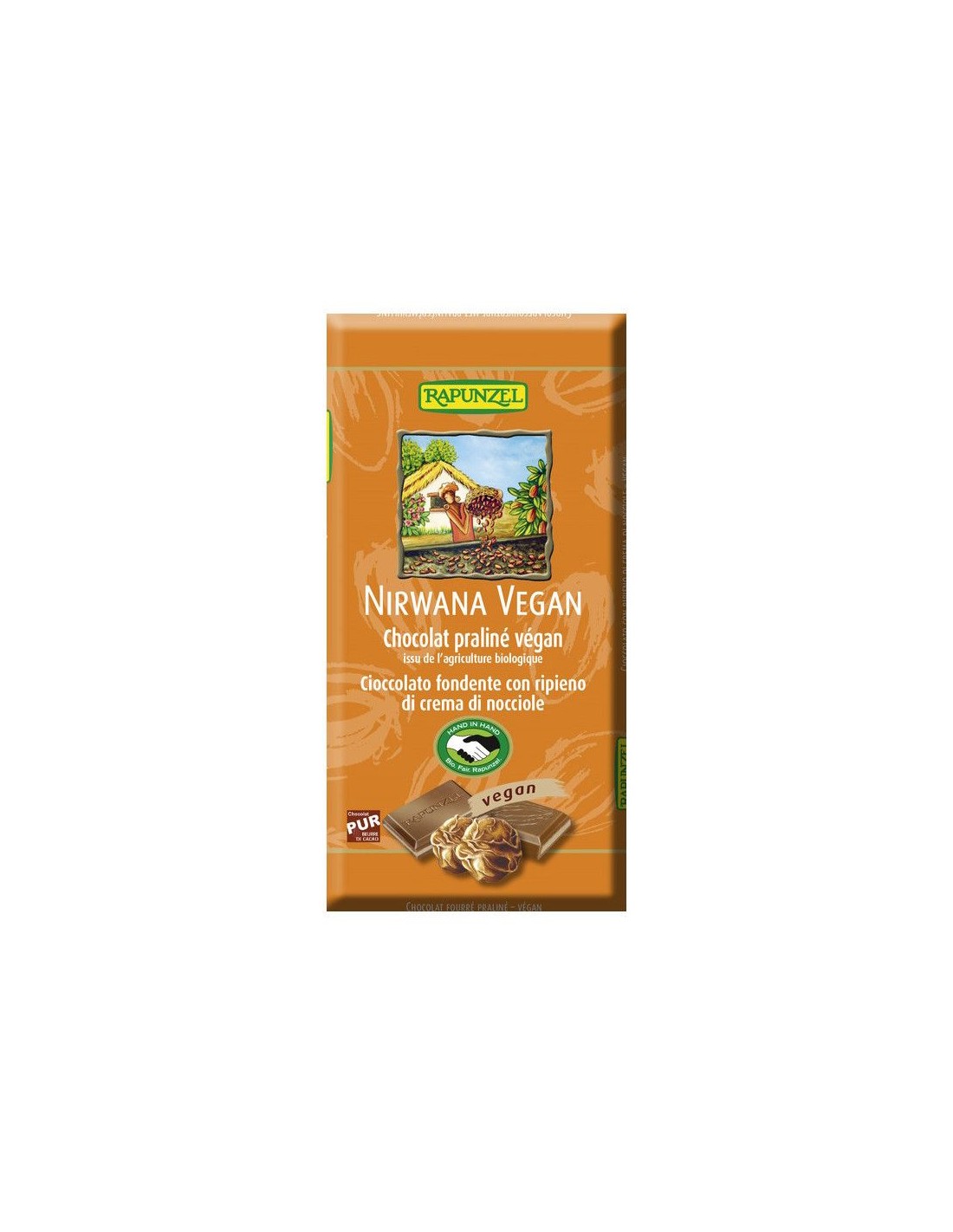 Ingredientes: Açúcar*: (açúcar de cana integral*, açúcar de cana*), Avelãs*(21,00%), manteiga de cacau*, massa de cacau*, xarope de arroz em pó*(7,00%), cacau em pó*, sal marinho, emulsionante: lecitina de girassol*, baunilha Bourbon*. (*) Da agricultura biológica.Valor nutricional por 100 gramas:
