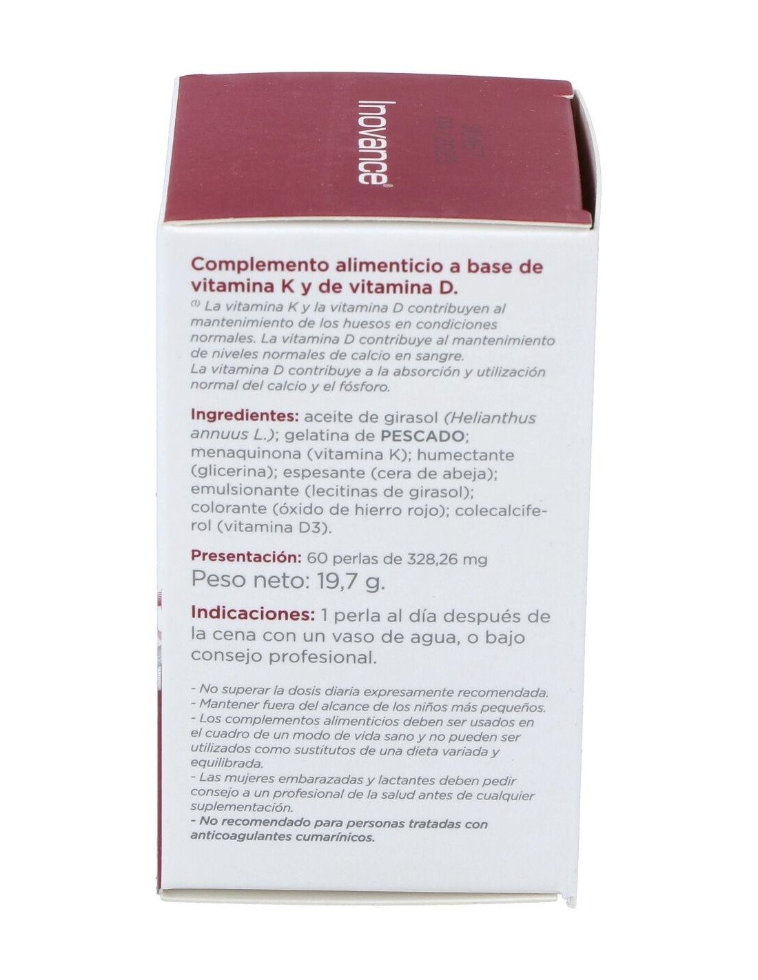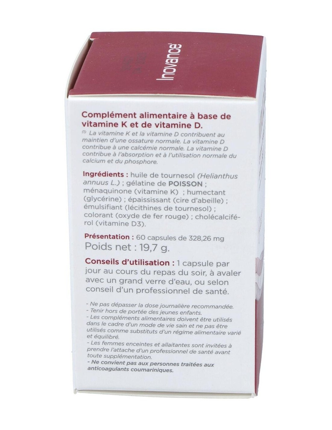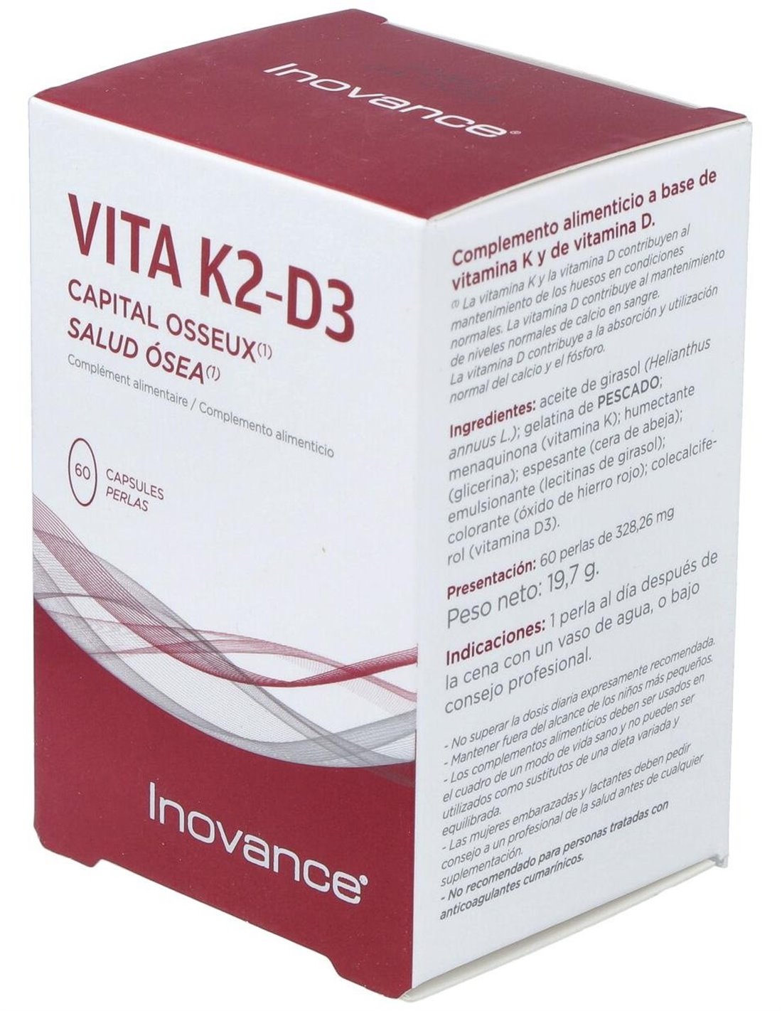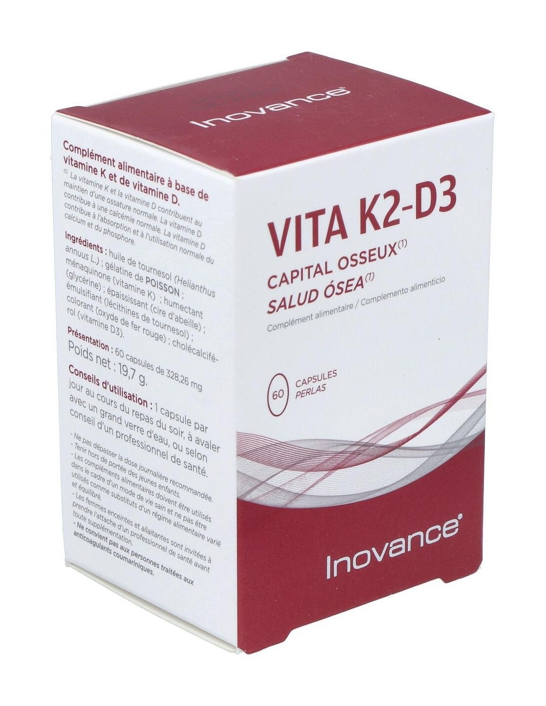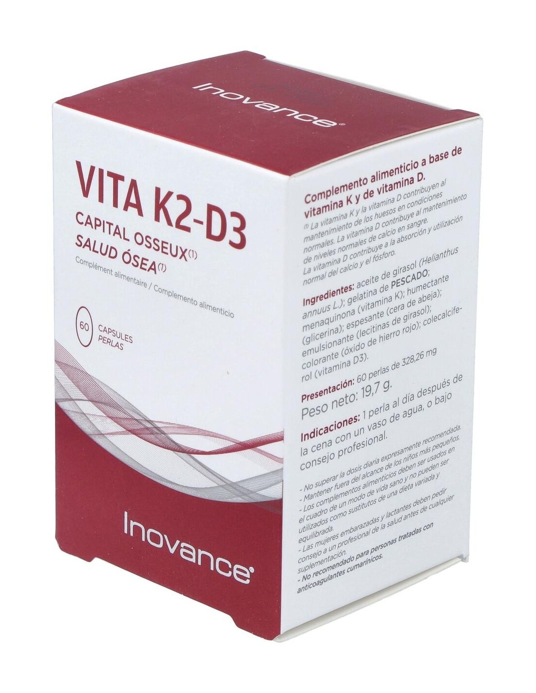 Inovance Vita K2 D3 Bone Health 60caps é um suplemento alimentar que contribui para a saúde óssea normal, graças à sua fórmula rica em vitaminas K e D.