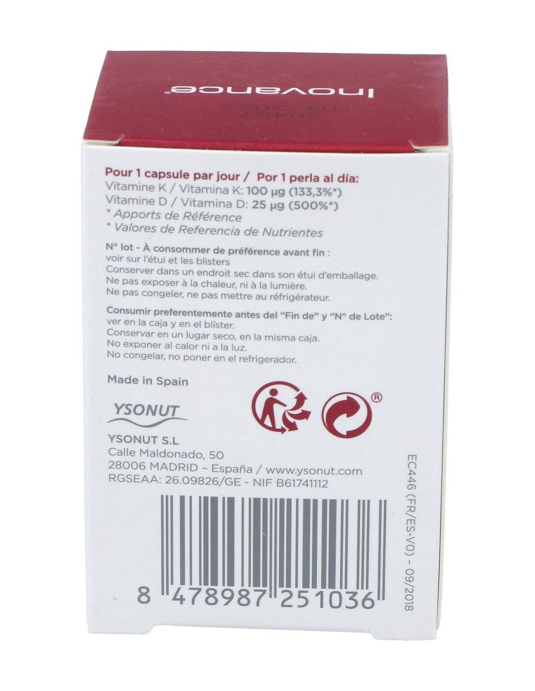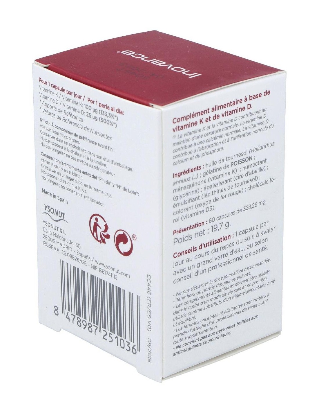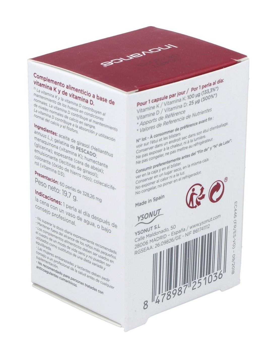 Óleo de Girassol, Gelatina de Peixe, Menaquinona-7 (Vitamina K2), Hidratante (Glicerina), Espessante (Cera de Abelha), Emulsificante (Lecitina de Girassol), Corante (Óxido de Ferro Vermelho), Colecalciferol (Vitamina D3).