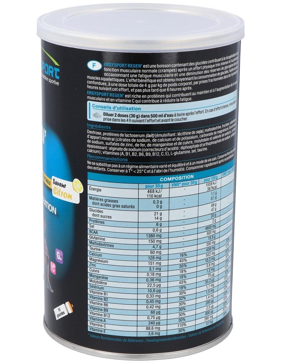 bicarbonato de sodio, gluconato de zinc, selenita de sodio, sulfatos de hierro, manganeso y cobre, molibdato de sodio), sabores naturales limón, espesante: alginato de sodio, glutamina, sal, vitaminas A, B1, B2, B6, B9, B12, C, E, taurina.