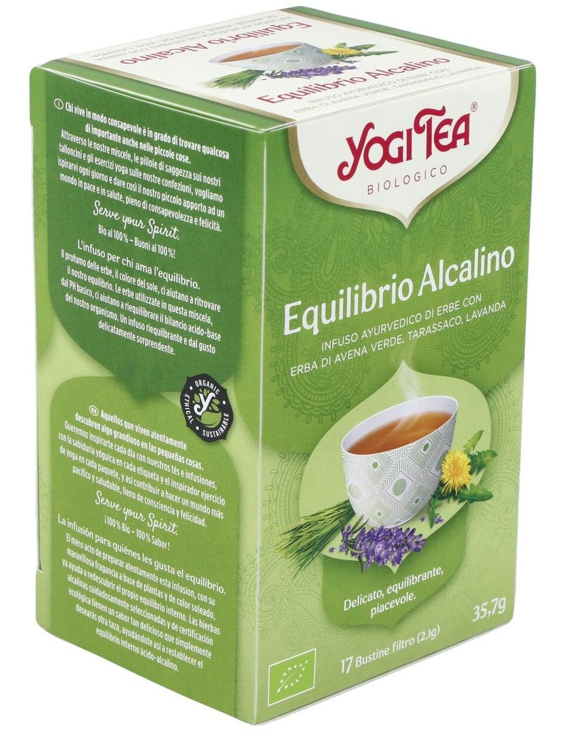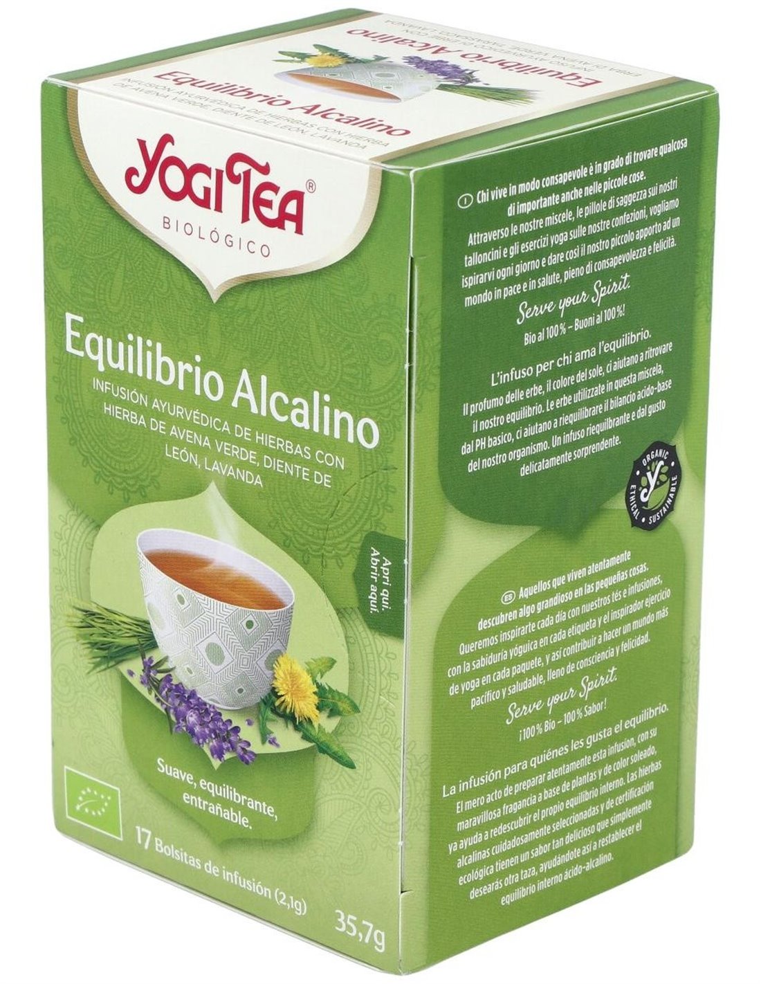 El Yogi Tea Equilibrio Alcalino 17 x 2,1 g es una infusión para personas que buscan mantener el balance ácido-base, formulada con una mezcla de hierbas que contribuye a una sensación de bienestar diario.