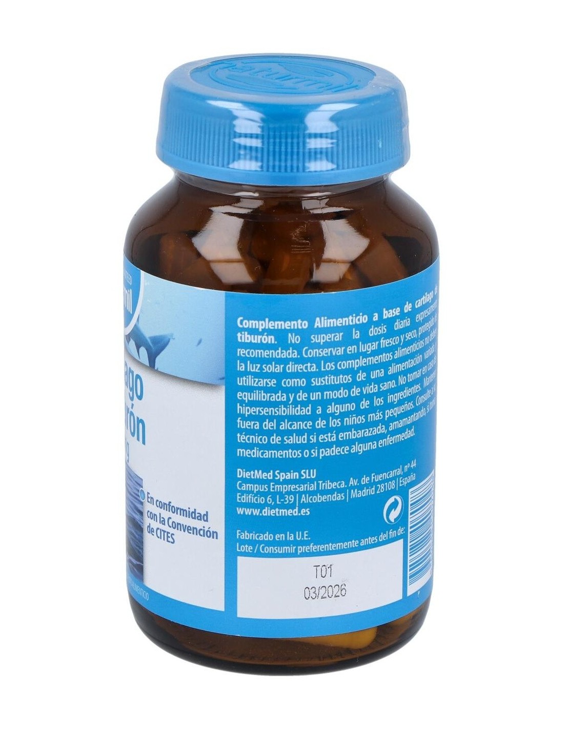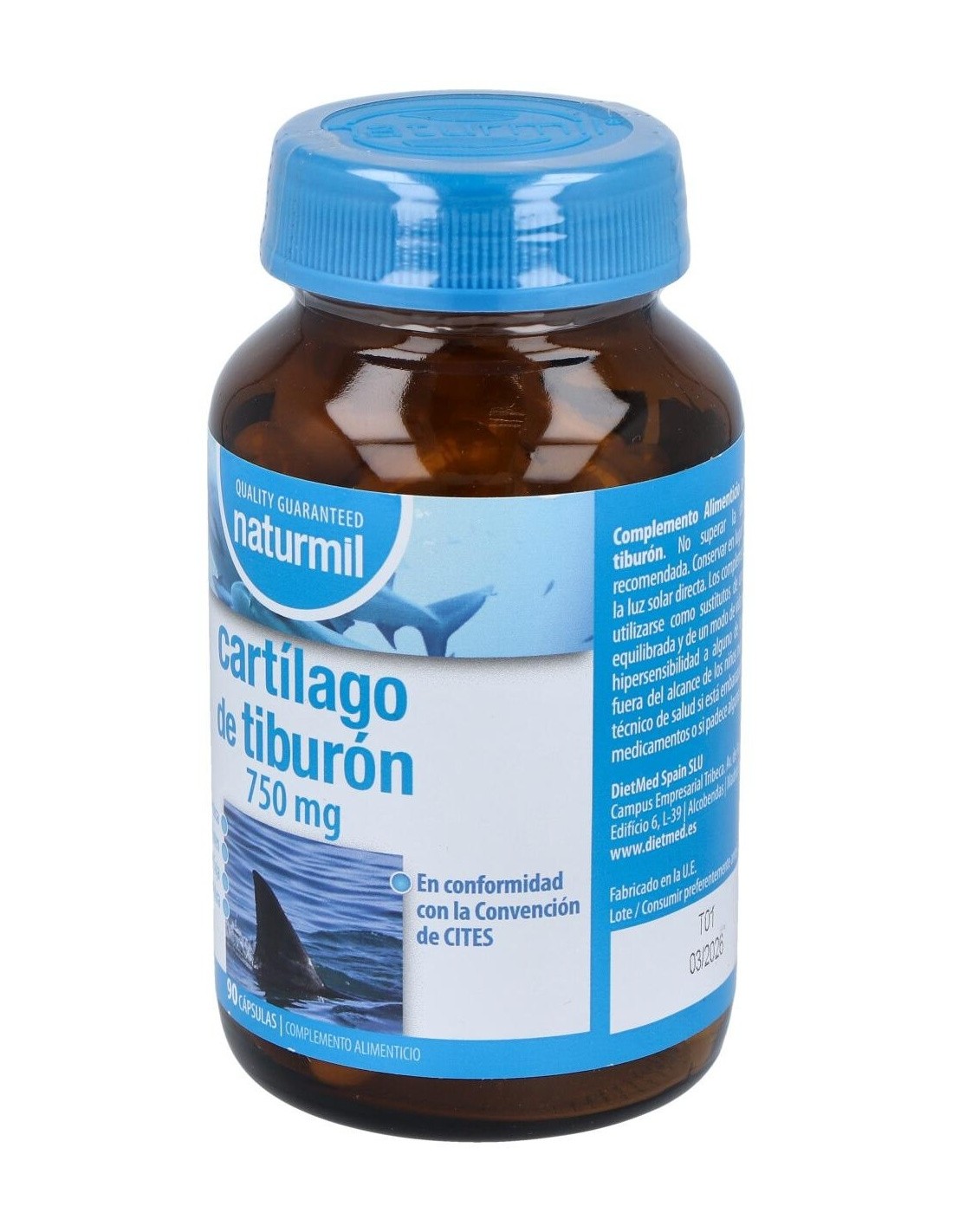 El Cartílago de Tiburón 750 mg en presentación de 90 cápsulas de Dietmed está diseñado para personas que buscan complementar su dieta con ingredientes derivados de fuentes marinas. Este producto es adecuado para quienes desean incorporar un suplemento que aporte componentes específicos presentes en el cartílago de tiburón.