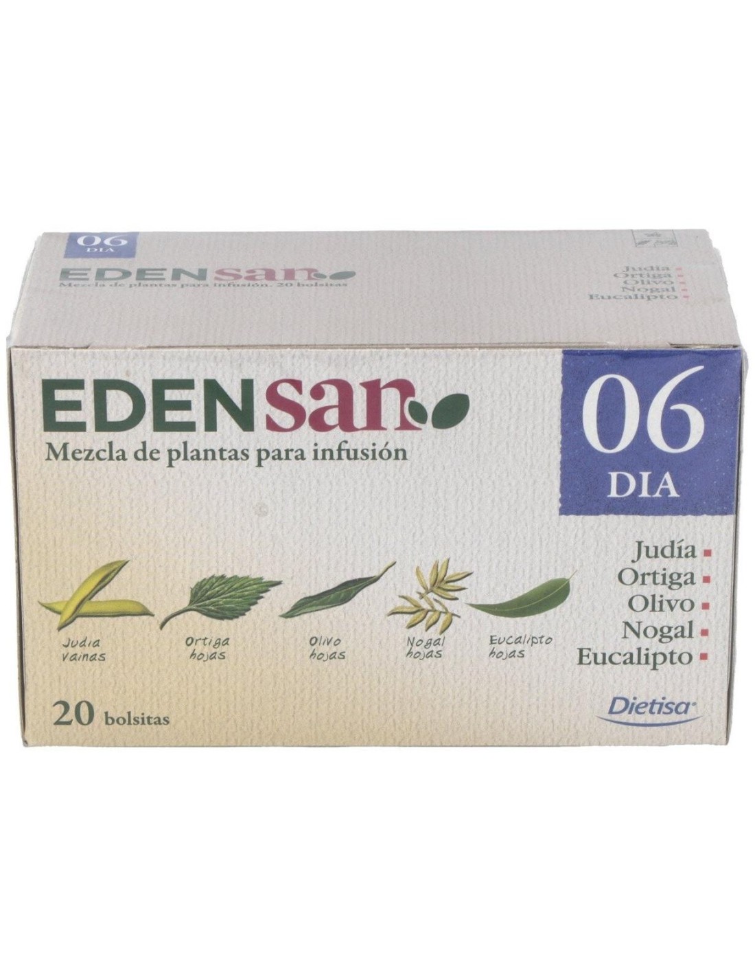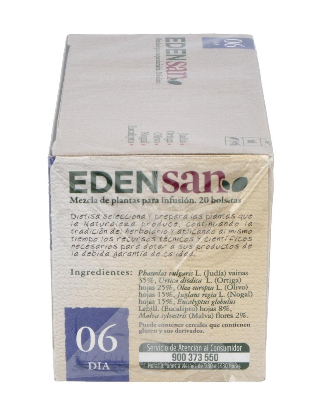 Phaseolus vulgaris L. (Judía) vainas 15%, Urtica dioica L. (Ortiga) 25%, Olea europea L. (Olivo) hojas 15%, Juglans regia L. (Nogal) hojas 15%, Eucaliptus globulus Labill (Eucalipto) hojas 8%, Malva sylvestris L. (Malva) flores 2%