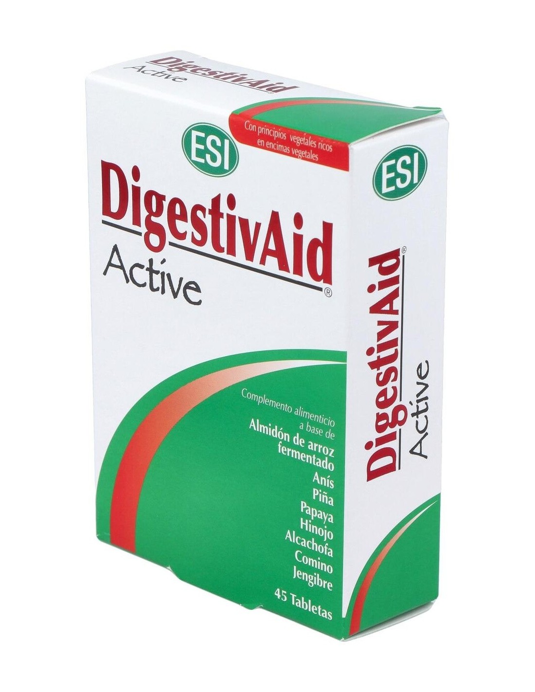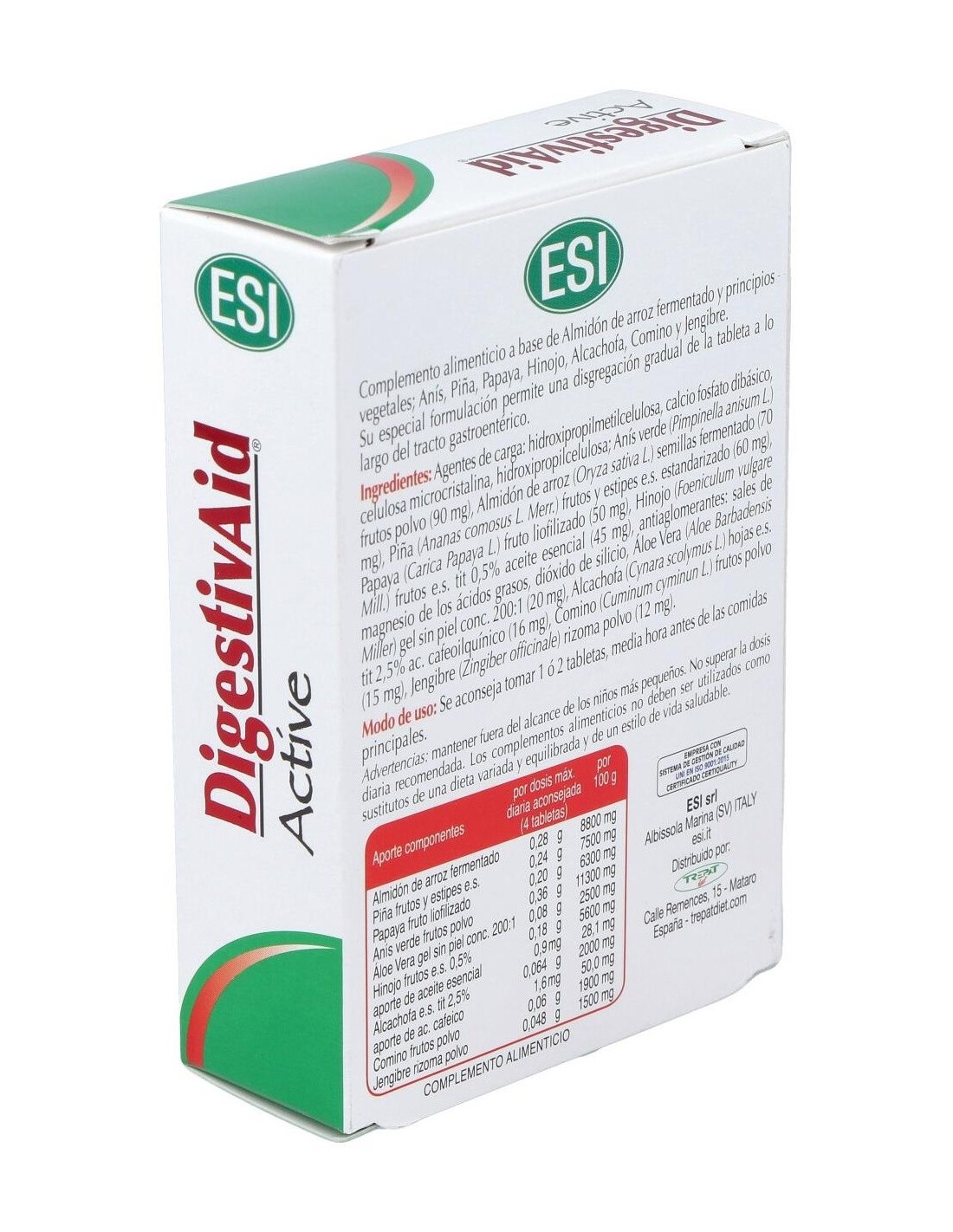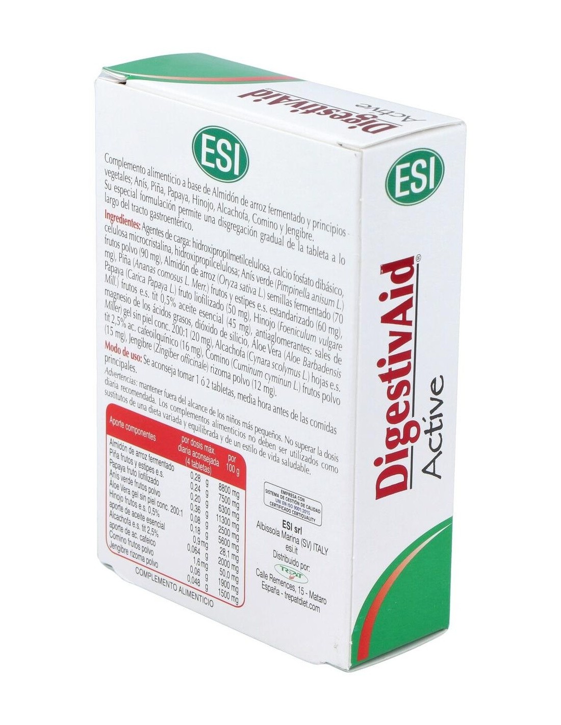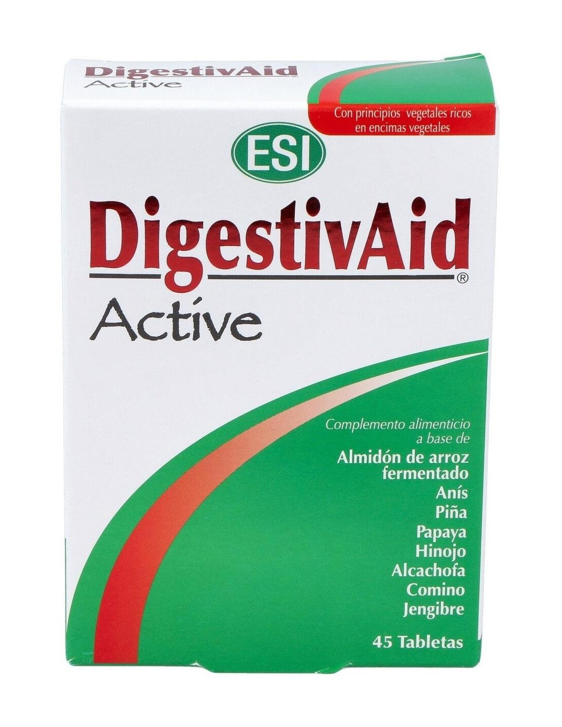 Las tabletas de Digestivaid Active de ESI son un complemento alimenticio que favorece la correcta digestión del organismo. Indicado para personas con problemas de digestión pesada, desórdenes gásticos o desequilibrios en las funciones metabólicas y digestivas. Elaboradas a base de Almidón de arroz fermentado con Papaina, Piña, Aloe y principios vegetales, consiguen una óptima digestión.