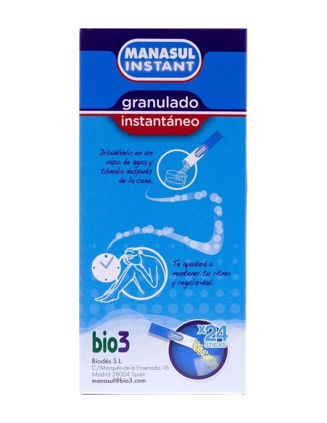 Bio3 Manasul Instant 24 sticks x 4g son unos sticks de granulado instantáneo, que ayudan a mantener el ritmo y la regularidad intestinal, a aquellas personas con estreñimiento o tránsito intestinal irregular. Su fórmula contiene una variedad de Cassia Angustifolia, que facilita el tránsito intestinal de manera natural y contribuye en la eliminación de grasas y toxinas.