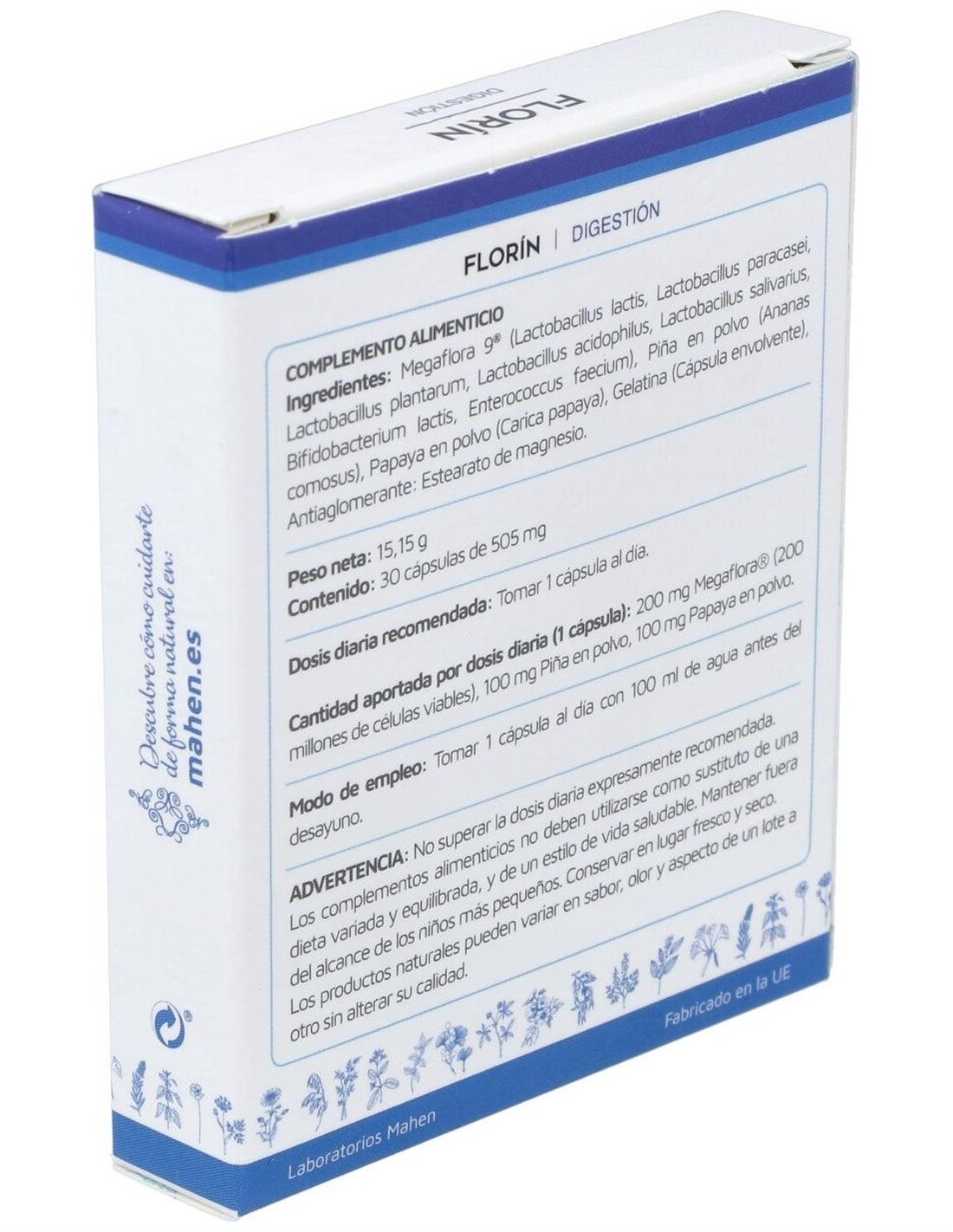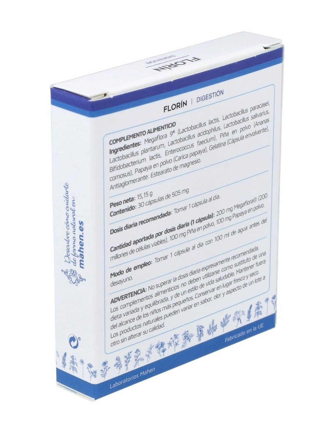 Megaflora 9 (Lactococcus lactis, Lactobacillus paracasei, Lactobacillus plantarum, Lactobacillus acidophilus, Lactobacillus salivarius, Bifidobacterium lactis, Enterococcus faecium), Piña en polvo (Ananas comosus) Papaya en polvo (Carica papaya)