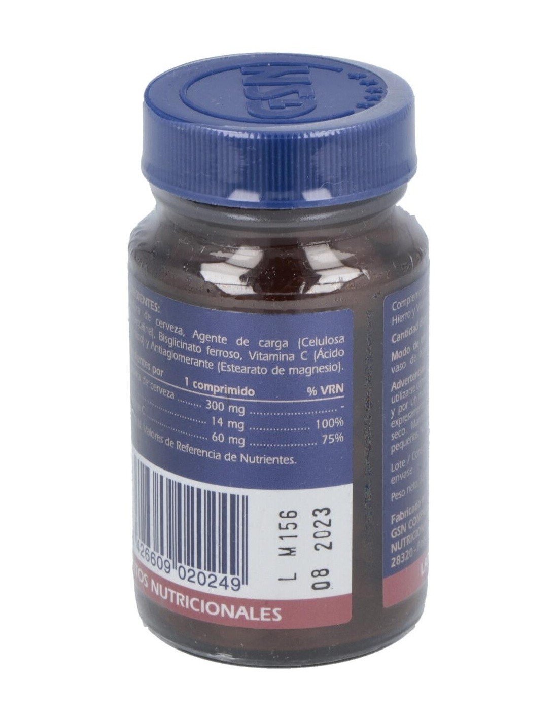 Hierro, bisglicinato 78 mg aporta 14 mg de hierro, Vitamina C 60 mg, Levadura de cerveza 300 m.