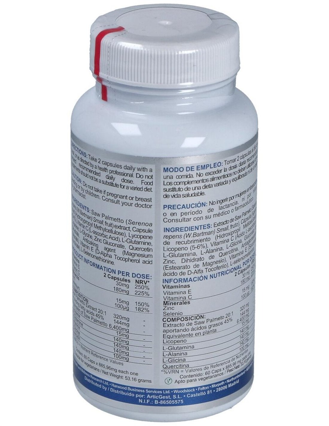 2 CÁPSULAS APORTAN: EXTRACTO DE SAW PALMETTO (COMO EXTRACTO 20:1) 320 MG APORTANDO ÁCIDOS GRASOS 144 MG LICOPENO 15 MG L-ALANINA 140 MG L-GLICINA 140 MG L-GLUTAMINA 140 MG QUERCITINA 100 MG VITAMINA C 180 MG VITAMINA E 30 MG ZINC 15 MG SELENIO 100 ?G ENCAPSULADO CON: AGENTE DE RECUBRIMIENTO (HIDROXIPROPIL METILCELULOSA), ANTIAGLOMERANTE (ESTEARATO DE MAGNESIO).