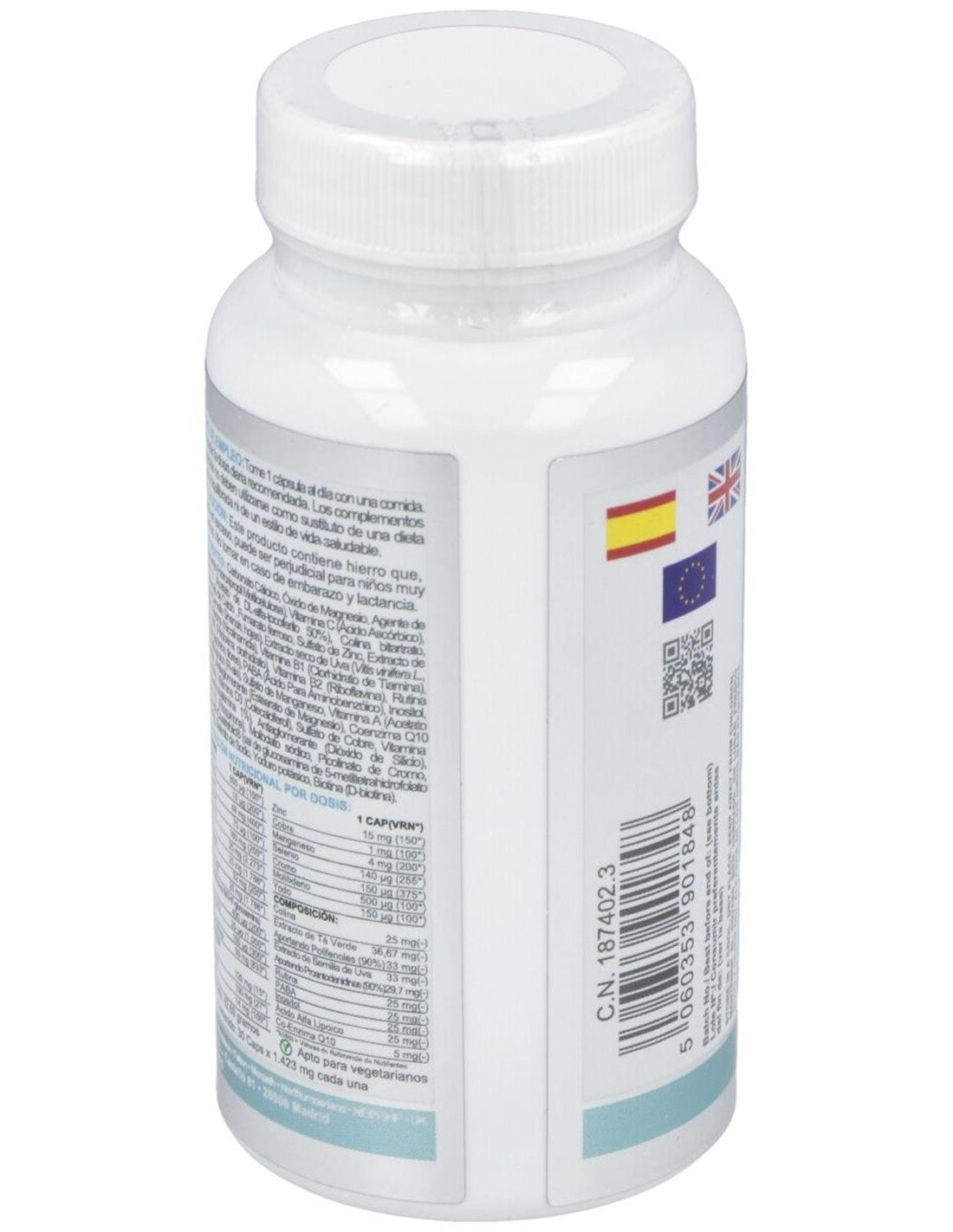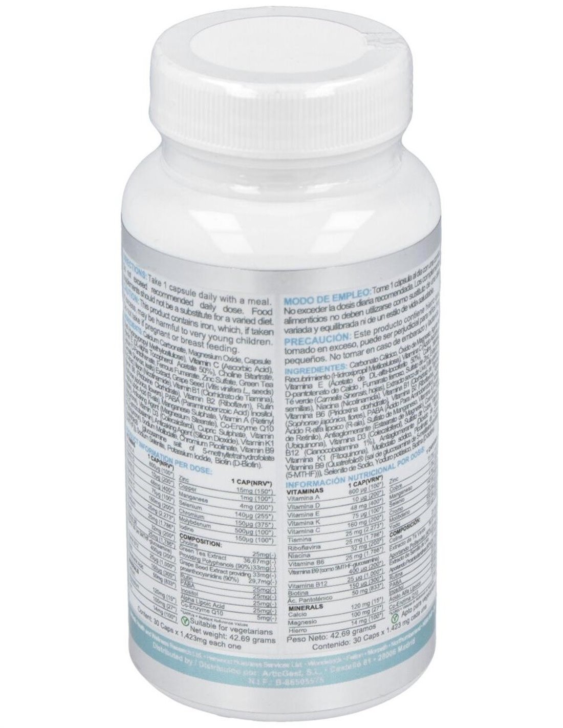 Vitamina A, Vitamina D, Vitamina E, Vitamina K, Vitamina C, Vitamina B1, Vitamina B2, Vitamina B3, Vitamina B5, Vitamina B6, Vitamina B9 (como Folato), Vitamina B12, Biotina, Calcio, Magnesio, Hierro, Zinc, Cobre, Manganeso, Selenio, Cromo, Molibdeno, Yodo, Colina, Inositol, Rutina, PABA, Co-Enzima Q10, Ácido Alfa Lipoico, Té Verde, Aportando Polifenoles, Semilla de Uva (extracto 50:1), Proantocianidinas, Agente de Recubrimiento (Hidroxipropil Metilcelulosa), Antiaglomerantes (Estearato de Magnesio, Dioxido de Silicio).