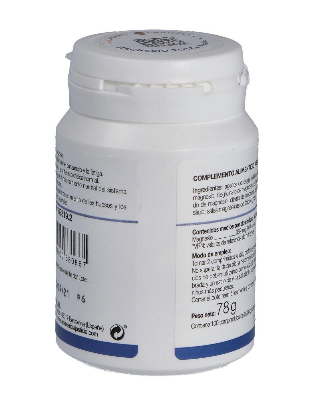 ?? Disminuye el cansancio y la fatiga.?? Contribuye al mantenimiento energético, síntesis proteica y función psicológica normal.?? Funcionamiento normal del sistema nervioso y de los músculos.?? Contribuye al mantenimiento de husso y dientes.Ingredientes activos por 2 comprimidos:346 mg de magnesio (bisglicinato, citrato, carbonato, óxido e hidroxido).Modo de empleo:Tomar 2 comprimidos al día.Presentación:Bote de 100 comprimidos.
