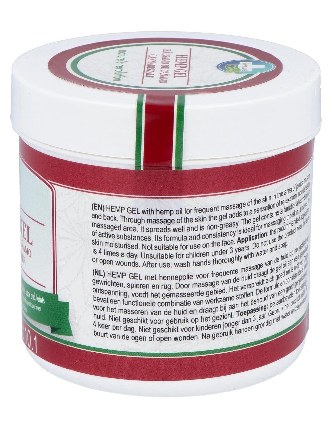 Gel de masaje a base de cáñamo para la piel en zonas amplias, tales como las piernas o la espalda, o bien para aplicación frecuente en la piel de las zonas de músculos, tendones y articulaciones, para ayudar a aliviar la sensación de dolor. Gel de masaje a base de cáñamo para la piel en zonas amplias, tales como las piernas o la espalda, o bien para aplicación frecuente en la piel de las zonas de músculos, tendones y articulaciones, para ayudar a aliviar la sensación de dolor.