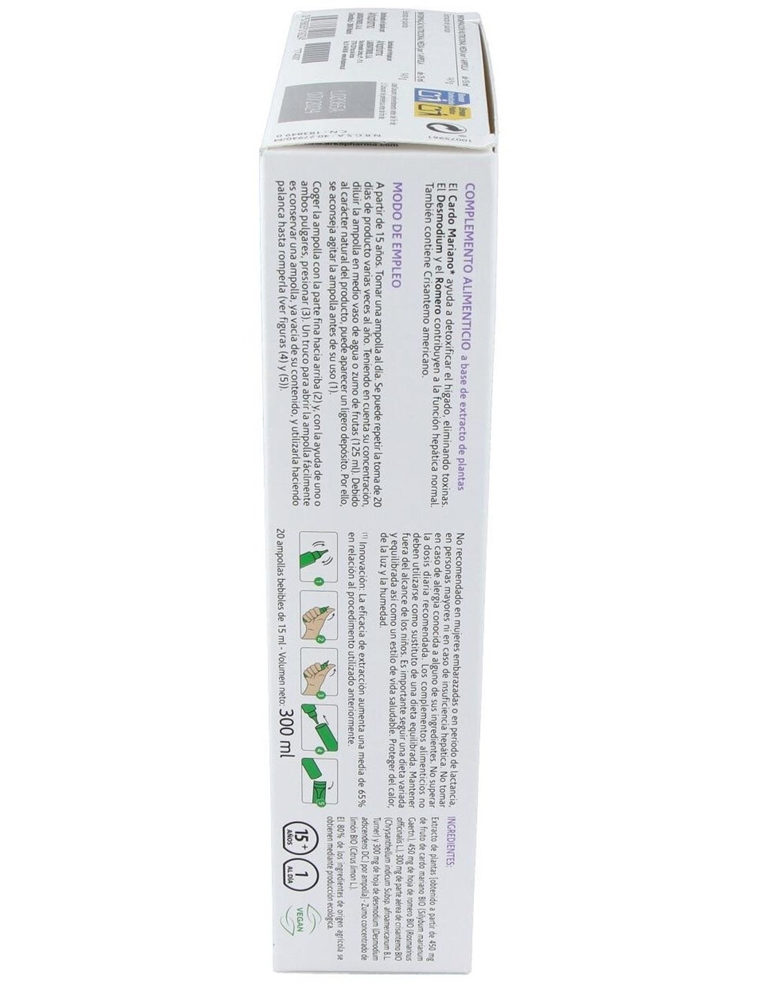 (Silybum marianum Gaertn.), 450 mg de hoja de romero BIO (Rosmarinus officinalis L.), 300 mg de parte aérea de Crisantemo BIO (Chrysanthellym indicum Subsp. Afroamericanum B.L. Turner) y 300 mg de hoja de desmodium (Desmodium adscendens DC.) por ampolla) -Zumo concentrado de limón BIO (Citrus limon L.).