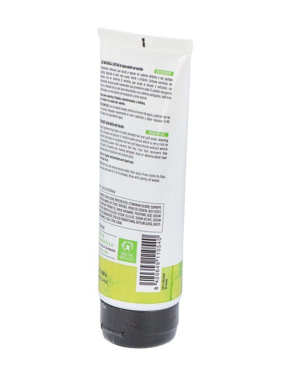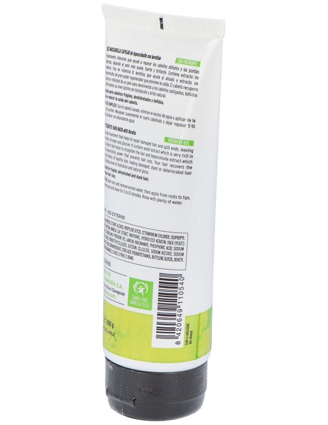 Repara en profundidad los cabellos dañados y las puntas abiertas, dejando el pelo más suave, fuerte y brillante. Gracias al extracto de levadura, muy rico en vitaminas del grupo B, y al extracto de Tepezcohuite, de gran poder regenerador, el cabello recupera la fuerza y elasticidad de un pelo sano, devolviendo a los cabellos castigados, teñidos o deteriorados, su nivel óptimo de hidratación, brillo y flexibilidad natural. Indicado para cabellos frágiles, deshidratados y teñidos. Ayuda a reducir la caída del cabello.