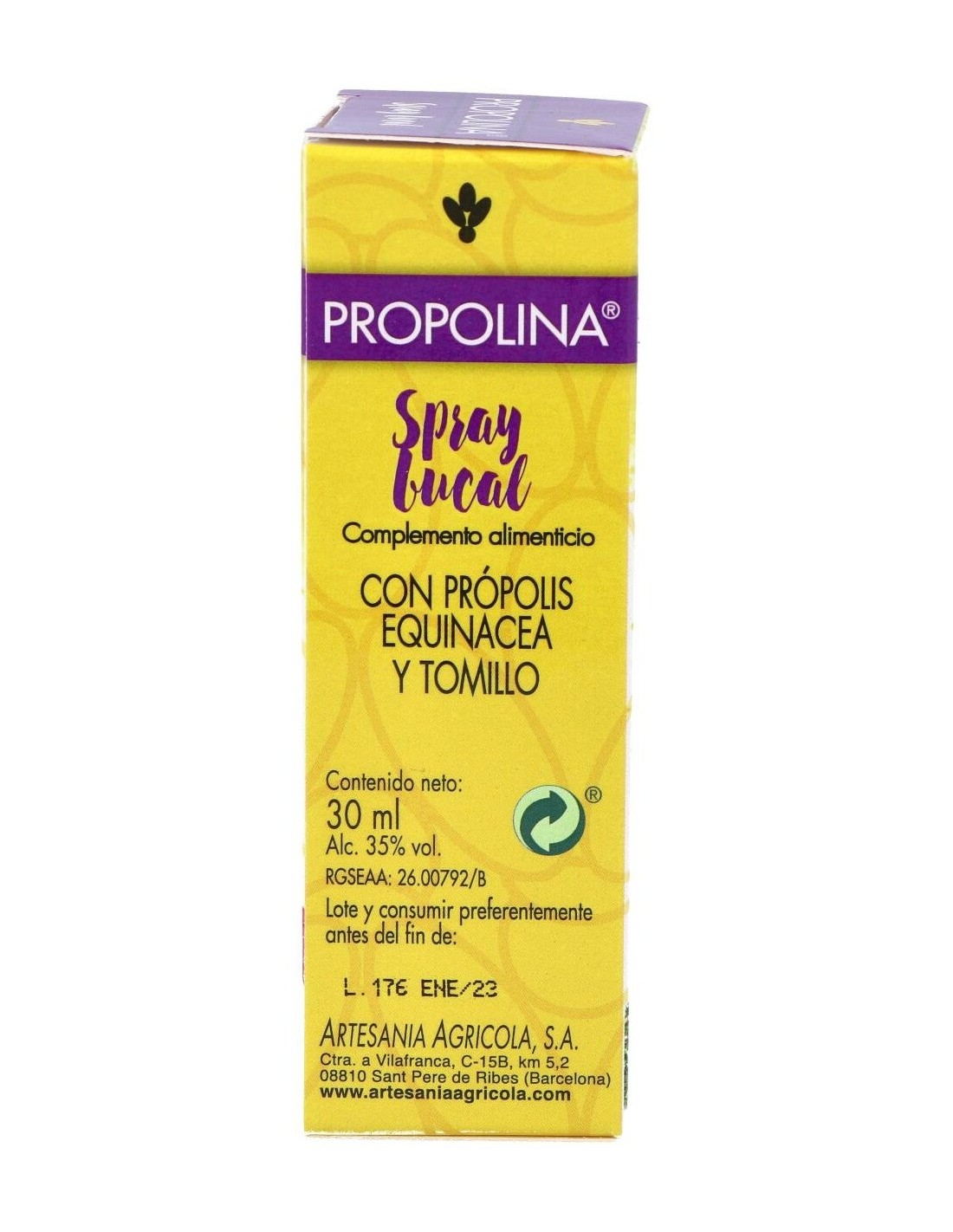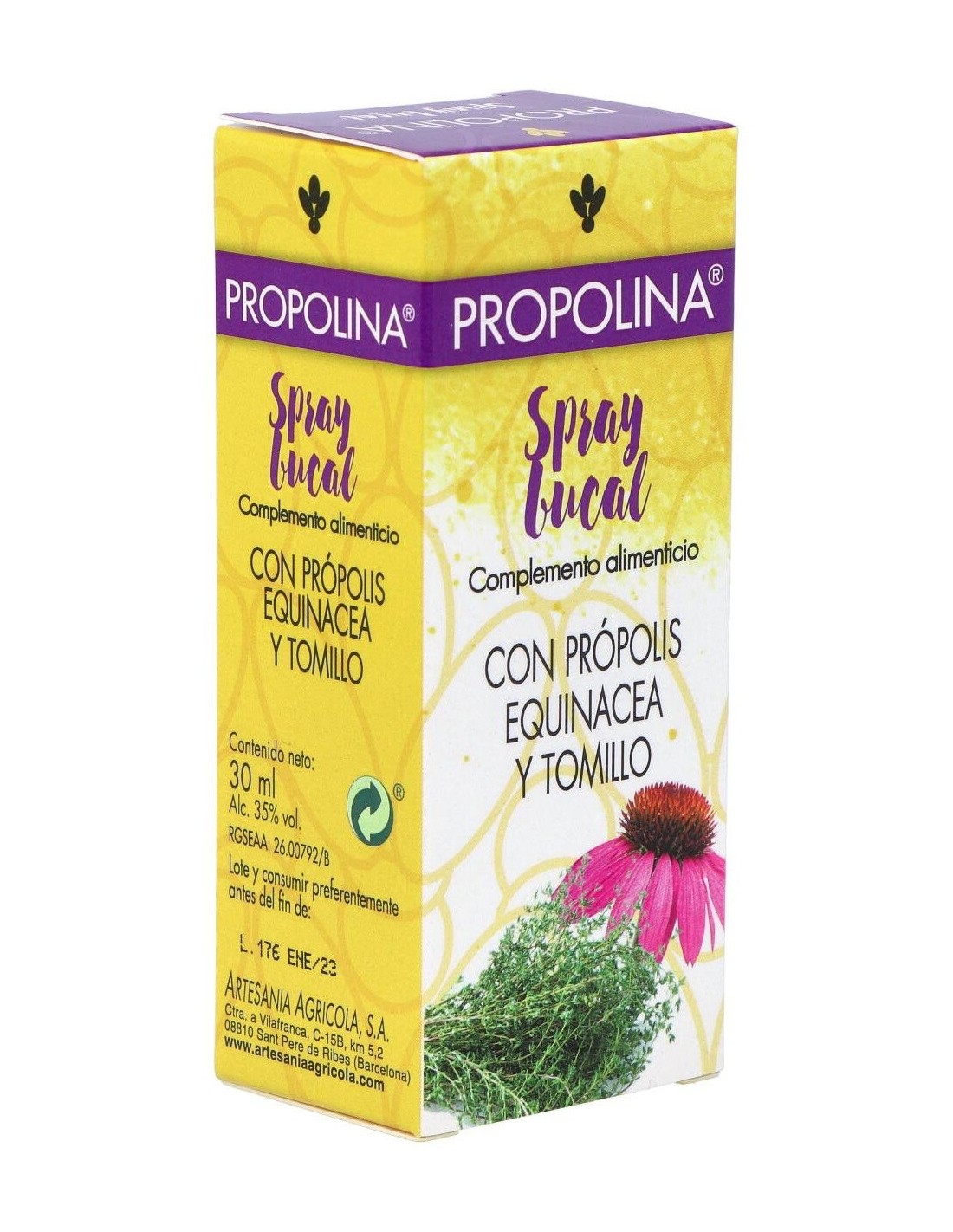 Complemento alimenticio presentado en formato spray que ayuda a aliviar el dolor y escozor en caso de dificultad al tragar la saliva. Está compuesto con propóleo y extractos vegetales. Cuida la garganta y las vías respiratorias. Contribuye en tratar de mejorar las defensas y ayudar a conseguir una buena salud. No se han empleado productos químicos ni artificiales.