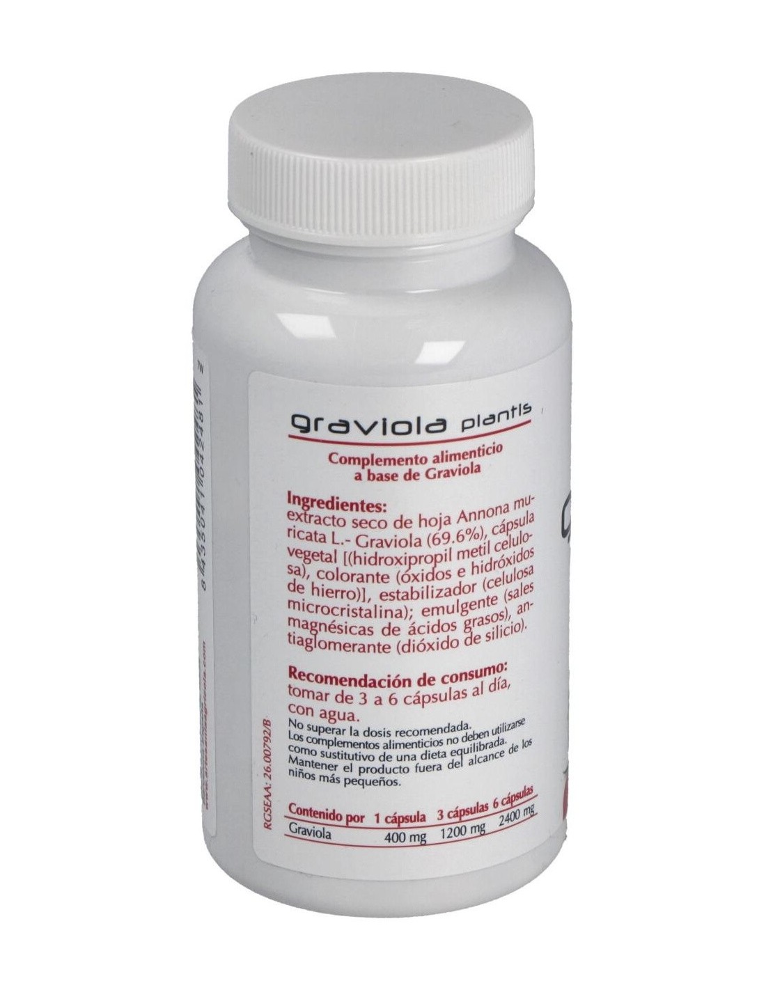 Extracto Seco De Hoja Annona Muricata L.-Graviola (69,6%), Cápsula Vegetal, Colorante, Estabilizador (Celulosa Microcristalina); Emulgente (Sales Magnésicas De Ácidos Grasos), Antiaglomerante (Dióxido De Silicio).