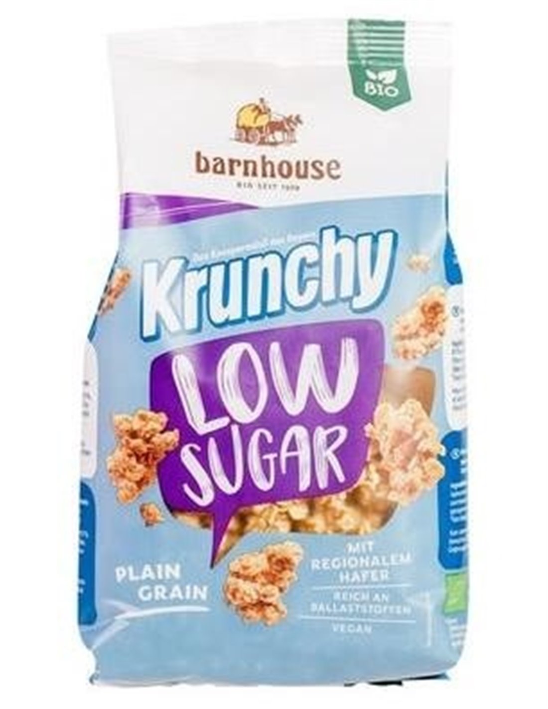 Muesli de avena Krunchy bajo en azúcar. Alto contenido de fibra. Con aceite de girasol. Vegano.