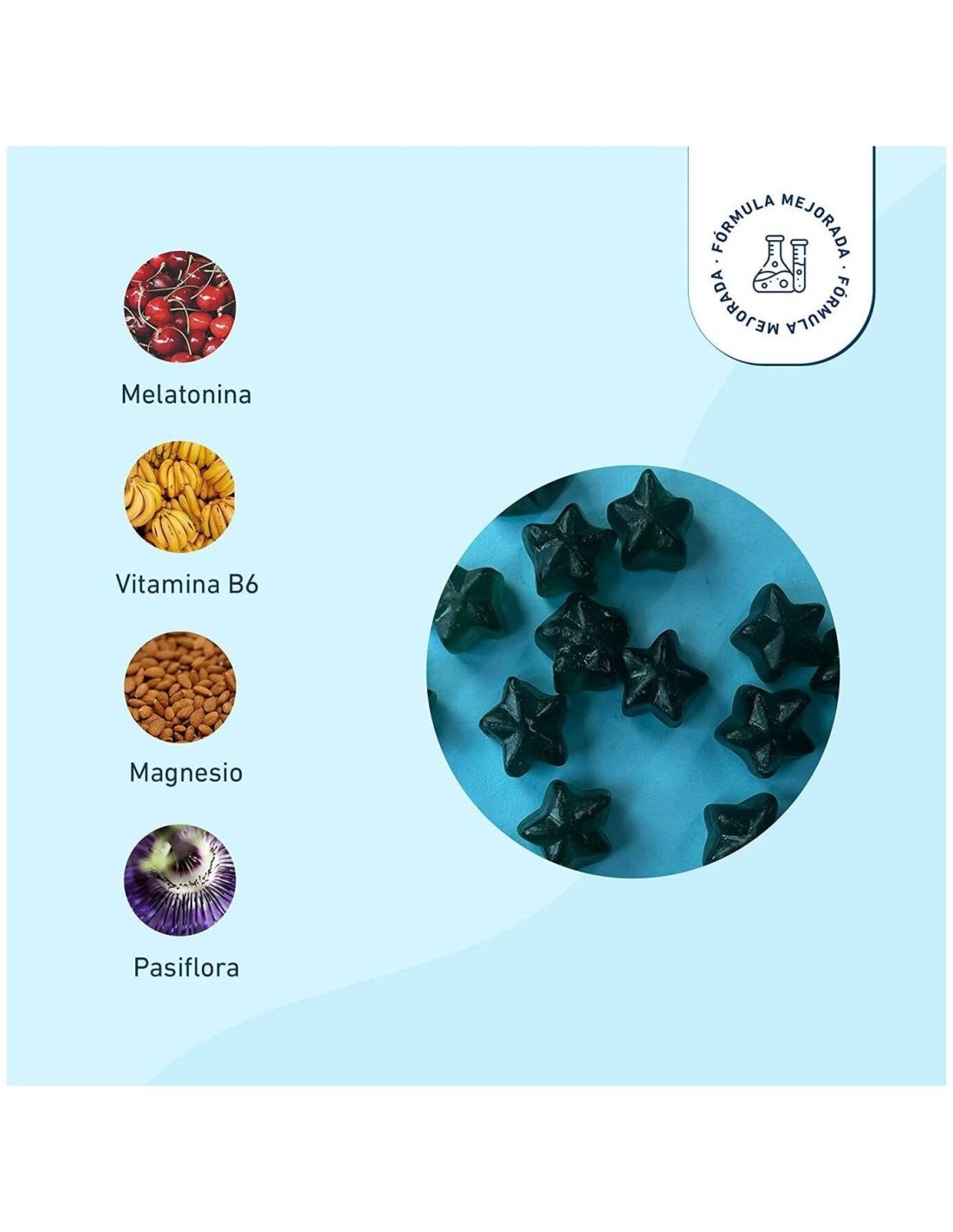 FOS (Fructo-oligosacáridos), agua, citrato de magnesio, gelificante (Pectina), maltodextrina, acidulante (ácido cítrico), concentrado de espirulina (Spirulina platensis), extracto de pasiflora (Passiflora incarnata, partes aéreas), corrector de acidez (citrato de sodio) , aceite vegetal (coco), aroma natural, melatonina, antiaglomerante (cera de carnauba) y clorhidrato de piridoxina (Vitamina B6).