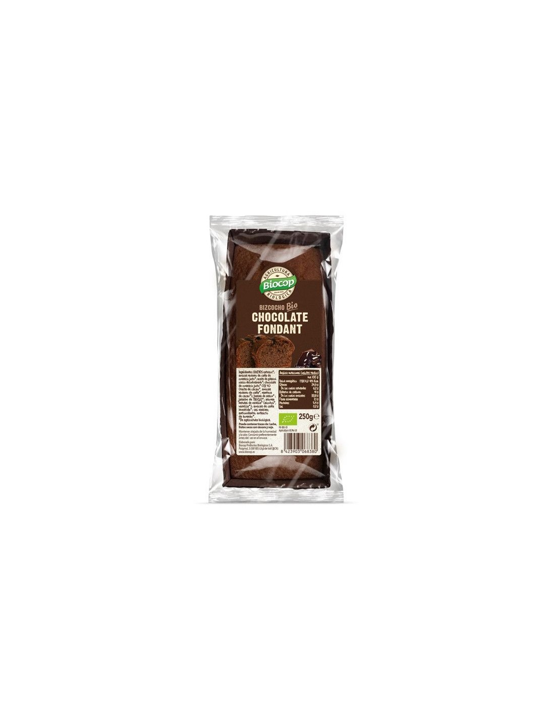 BIOCOPBizcocho de chocolate fondant. Con una textura esponjosa y un sabor intenso. Elaborado artesanalmente con ingredientes de primera calidad. Azúcar de caña y chocolate de comercio justo. Huevos de corral ecológicos. Sin aceite de palma.