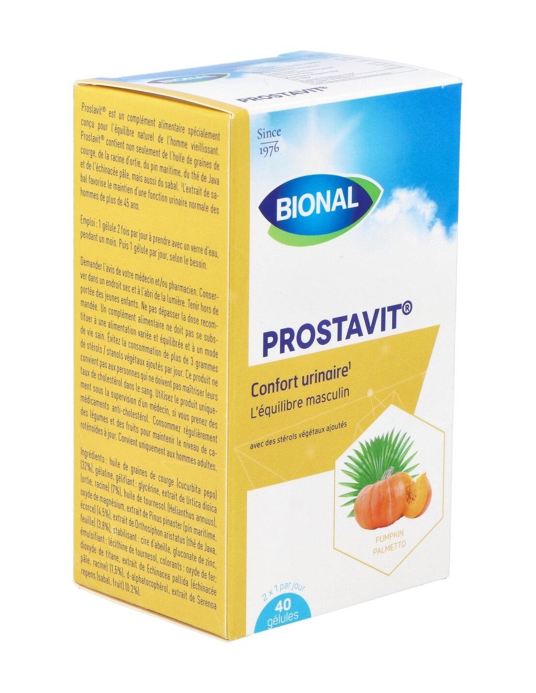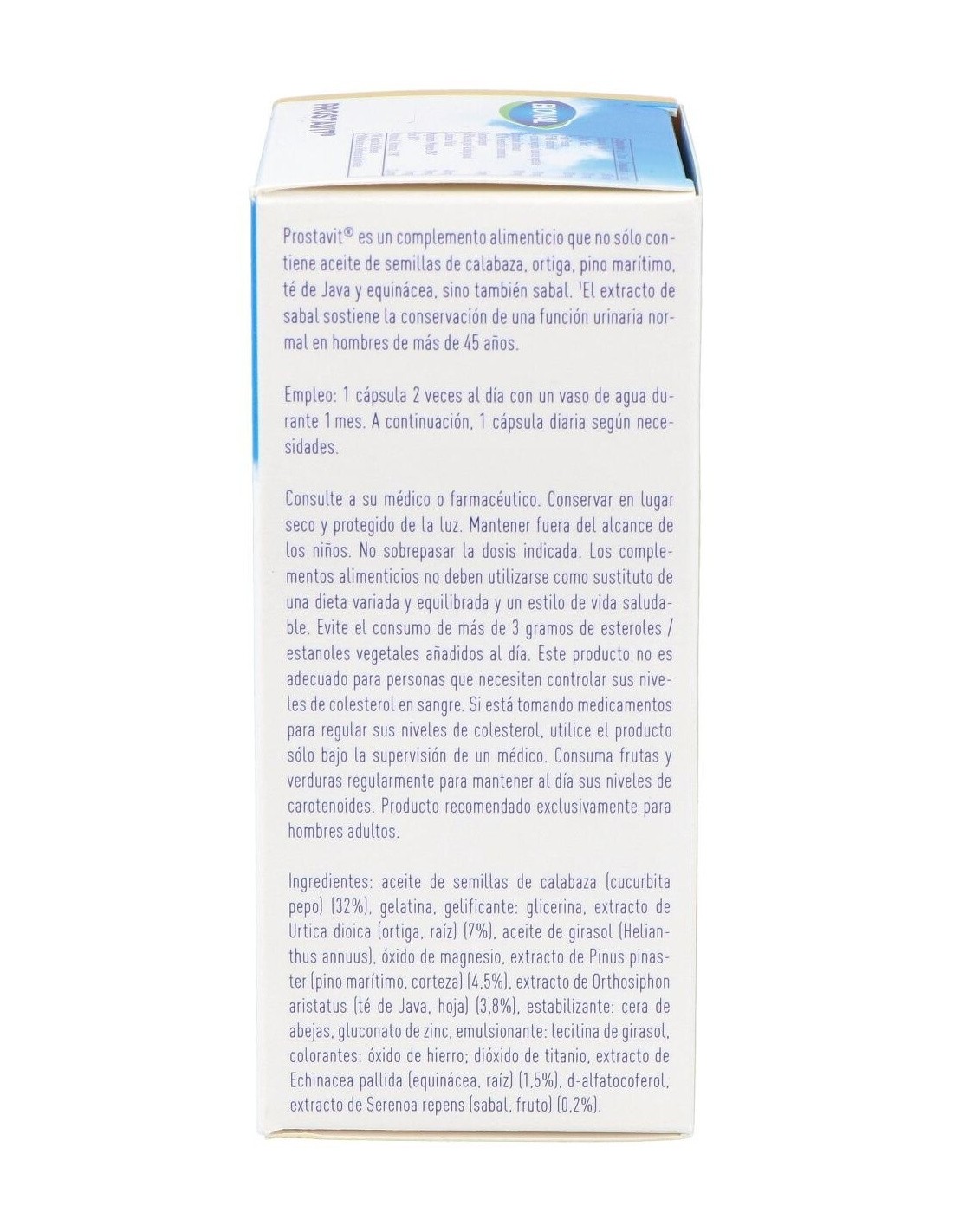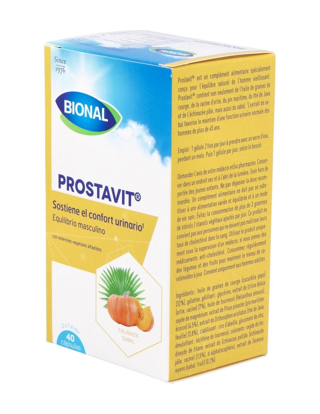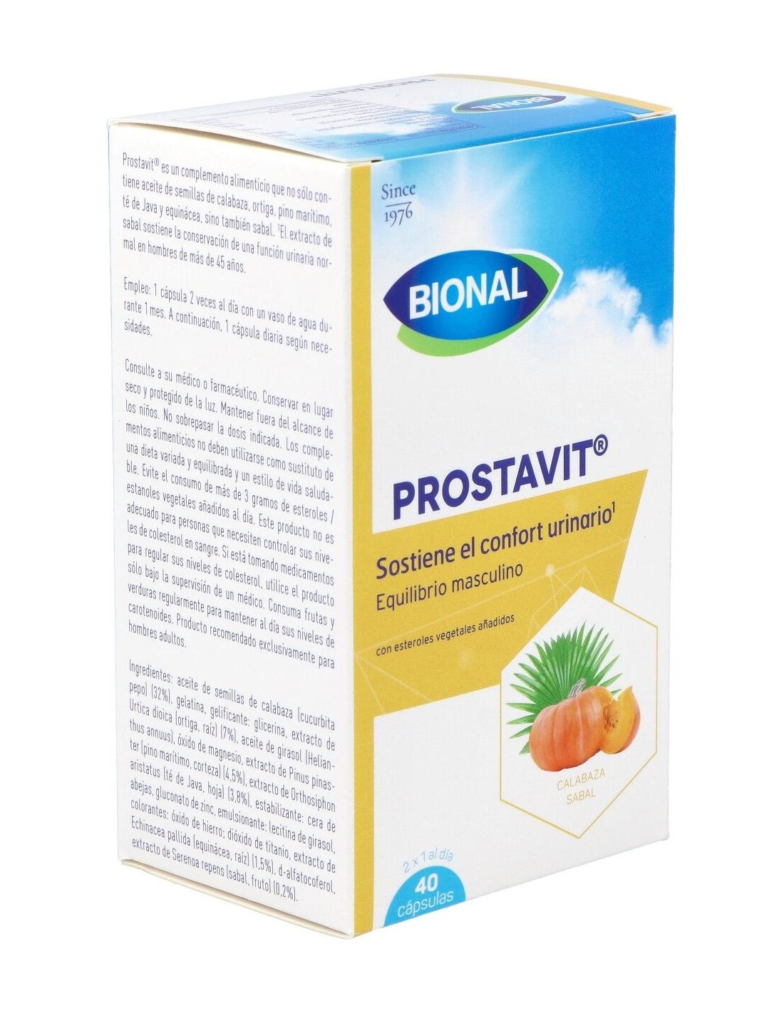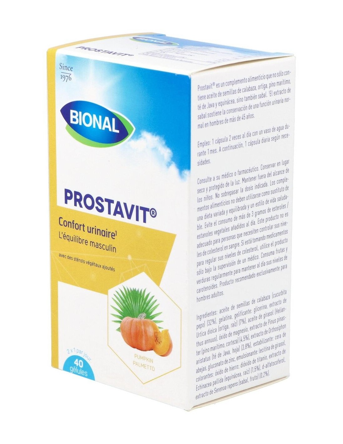Este producto de Bional es un complemento alimenticio fabricado específicamente para mantener un funcionamiento normal de la próstata y fortalecer el equilibrio natural del organismo en los hombres de edad madura. A dicha edad es frecuente que estos presenten un crecimiento benigno de la próstata, dificultades para orinar, urgencia repetitiva de orinar o incontinencia urinaria. En esos casos, la combinación de ingredientes de Prostavit puede resultar útil para paliar el problema.