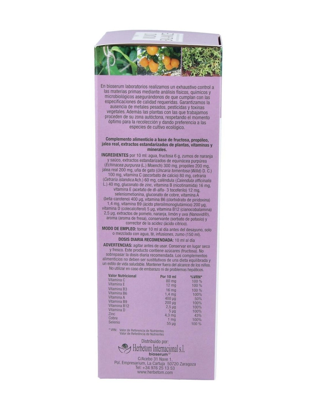 Agua, fructosa, zumos de naranja (Citrus sinensis (L.) Osbeck.) y saúco negro (Sambucus nigra L.), extractos nebulizados estandarizados de equinácea purpúrea (Echinacea purpurea (L.) Moench.) 300 mg, propóleo 200 mg, jalea real 200 mg, gluconato de magnesio, uña de gato (Uncaria tomentosa (Willd) D. C.) 100 mg, vitamina C (ácido l-ascórbico) 80 mg, cetraria (Cetraria islandica Ach.) 60 mg, caléndula (Calendula officinalis L.) 40 mg, gluconato de zinc 30 mg, vitamina B3 (nicotinamida) 16 mg, vitamina E (acetato de dl-alfa-tocoferilo) 12 mg, seleniometionina , gluconato de cobre, vitamina A (beta-caroteno) 800 µg , gluconato de manganeso, vitamina B6 (clorhidrato de piridoxina) 1,4 mg, vitamina B1 (clorhidrato de tiamina) 1,1mg, vitamina B9 (ácido pteroilmonoglutámico) 200 µg, vitamina D (colecalciferol) 5 µg, vitamina B12 (cianocobalamina) 2,5 µg, aroma (aroma de fresa), conservante (sorbato de potasio) y corrector de la acidez (ácido cítrico).