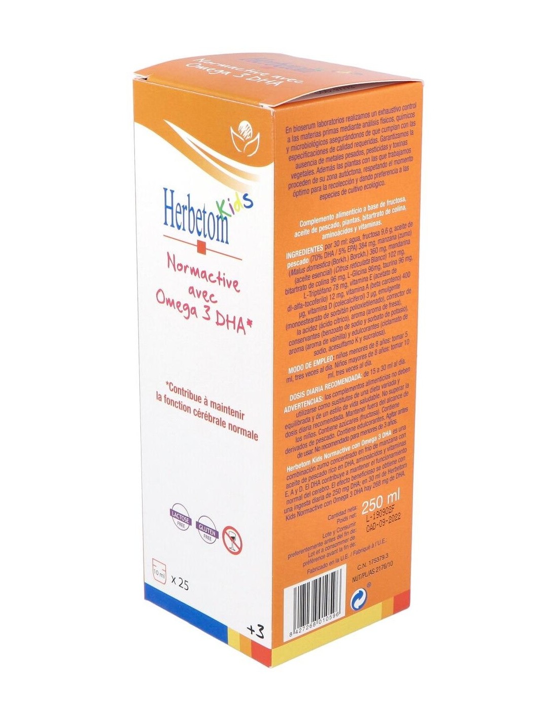 Herbetom Kids Normactive 250 ml es un complemento alimenticio rico en ácidos grasos omega-3, aminoácidos precursores de neurotransmisores y vitaminas liposolubles, que contribuye a mantener un rendimiento mental normal.