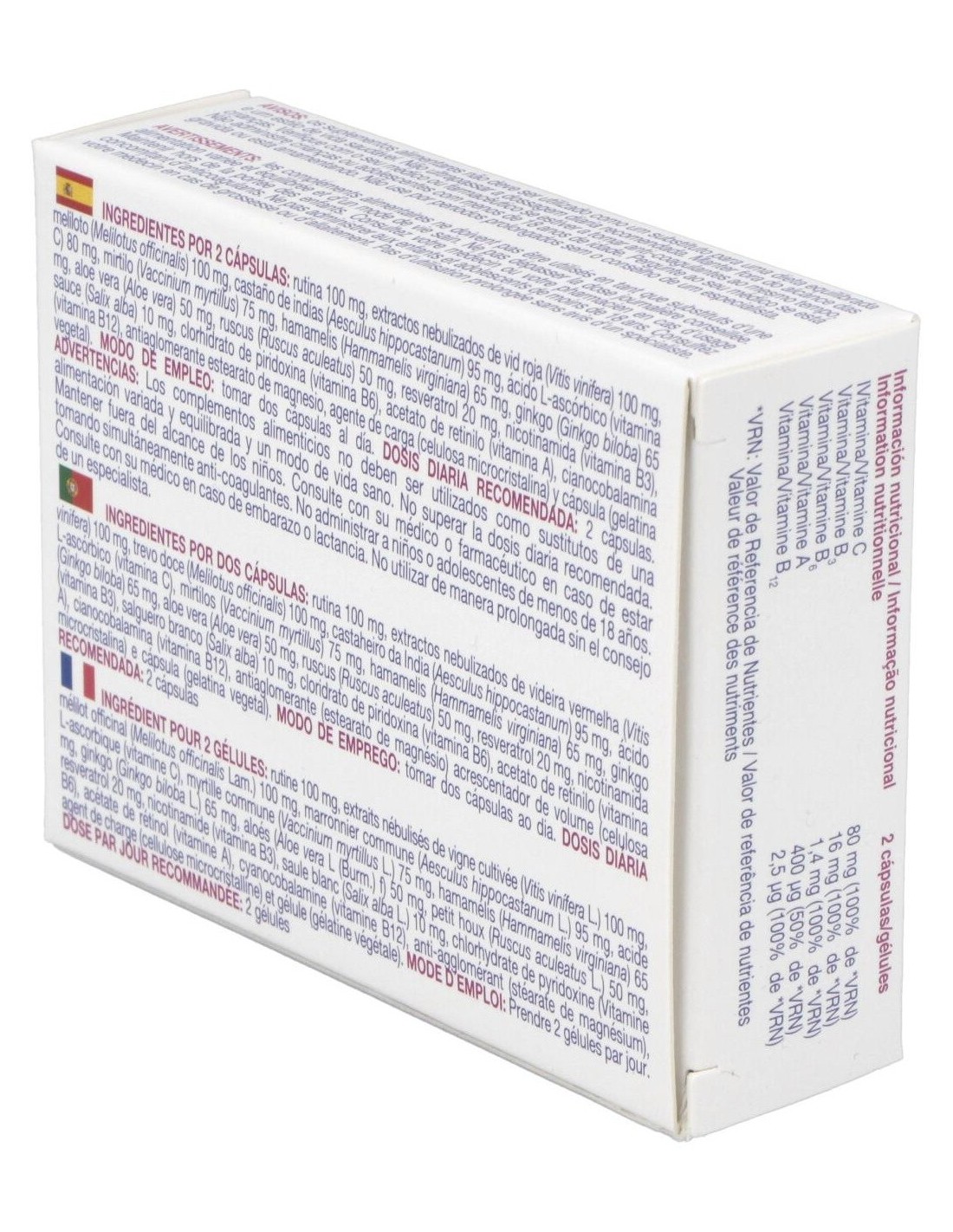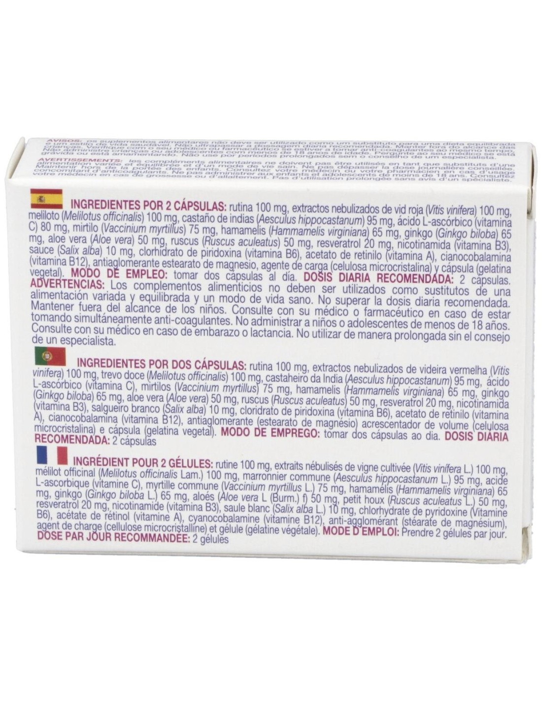 Ingredientes por dos cápsulas: rutina 100 mg, vitamina C (Ácido l-ascórbico) 80 mg,extractos estandarizados de meliloto (Melilotus officinalis Lam.) 100 mg, vid roja (Vitis vinífera L.) 100 mg, castaño de Indias (Aesculus hippocsatanum L.) 95 mg, mirtilo (extracto) (Vaccinium myrtillus L.) 75 mg, hamamelis (Hamamelis virginiana L.) 65 mg, rusco (Ruscus aculeatus L.) 50 mg, ginkgo (Ginkgo biloba L.) 65 mg, aloe (Aloe vera (L.) Burm. f.) 50 mg, polygonum (Polygonum cuspidatum Siebold et Zucc.) 40 mg (20 mg de resveratrol), vitamina B3 (nicotinamida) 16 mg, sauce blanco (Salix alba L.) 5 mg, vitamina B6 (clorhidrato de piridoxina) 1,4 mg, vitamina B2 (riboflavina) 1,4 mg, vitamina B1 (clorhidrato de tiamina) 1,1 mg, vitamina A (acetato de retinilo) 800 µg, vitamina B12 (cianocobalamina) 2,5 µg, antiaglomerante (estearato de magnesio), agente de carga (celulosa microcristalina) y envoltura gelatina.