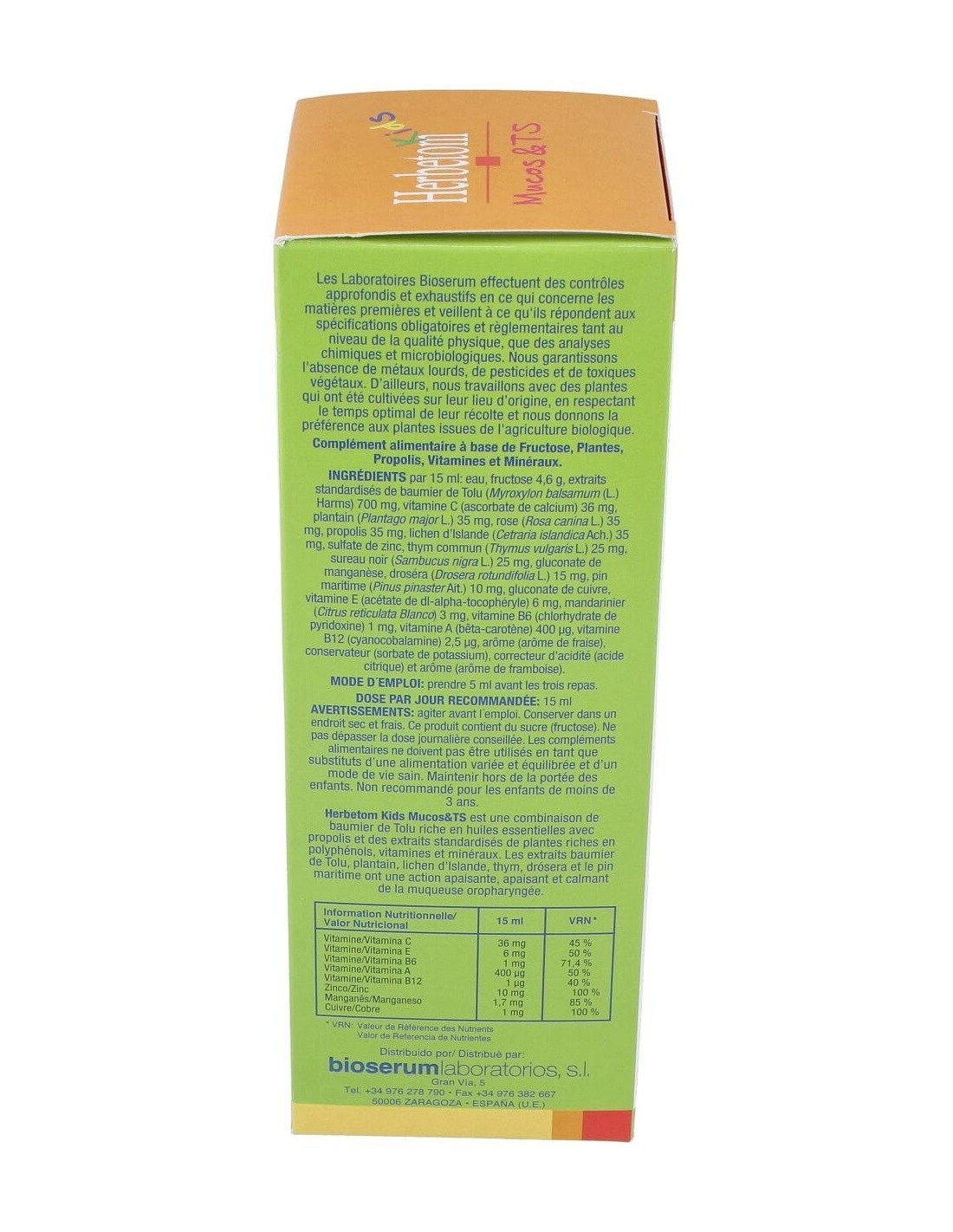 Ingredientes agua, fructosa 4,6g, extractos estandarizados de bálsamo de Tolu (Myroxylon balsamum (L.) Harms) 700 mg, vitamina C (ascorbato de calcio) 36 mg, llantén (Plantago major L.) 35 mg, rosa (Rosa canina L.) 35 mg, propóleo 35 mg, cetraria (Cetraria islandica Ach.) 35 mg, sulfato de zinc, tomillo (Thymus vulgaris L.) 25 mg, saúco negro (Sambucus nigra L.) 25 mg, gluconato de manganeso, drosera (Drosera rotundifolia L.) 15 mg, pino (Pinus pinaster Ait.) 10 mg, gluconato de cobre, vitamina E (acetato de dl-alfa-tocoferilo) 6 mg, mandarina (Citrus reticulata Blanco) 3 mg, vitamina B6 (clorhidrato de piridoxina) 1 mg, vitamina A (beta caroteno) 400 µg (50% VRN*), Vitamina B12 1 µg (40% VRN*), Zinc 10 mg (100% VRN*), Manganeso 1,7 mg (85% VRN*) y Cobre 1 mg (100% VRN*).