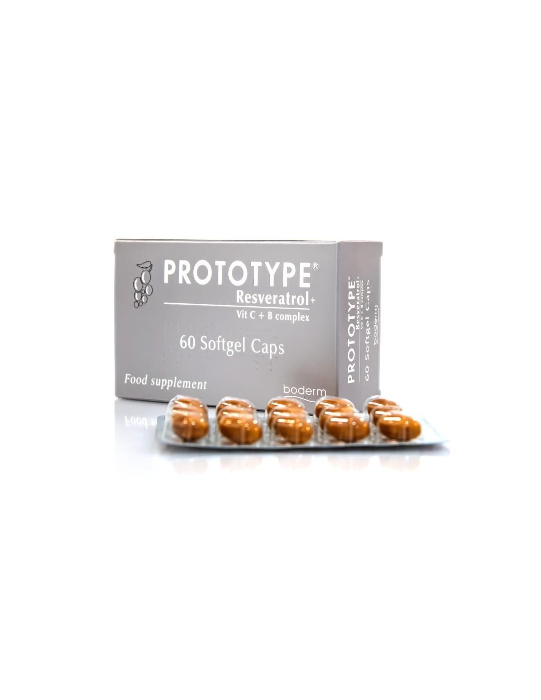 BODERMLas cápsulas de gel suave PROTOTYPE contienen resveratrol natural (un componente beneficioso del vino tinto ), de la raíz de la planta Polygonum cuspidatum, que es la mayor fuente de resveratrol en la naturaleza. Las cápsulas PROTOTYPE también contienen vitamina C y complejo vitamínico B. La vitamina C se caracteriza por su actividad antioxidante, y se considera esencial para ayudar a la síntesis de colágeno, para mantener la piel en condiciones normales.