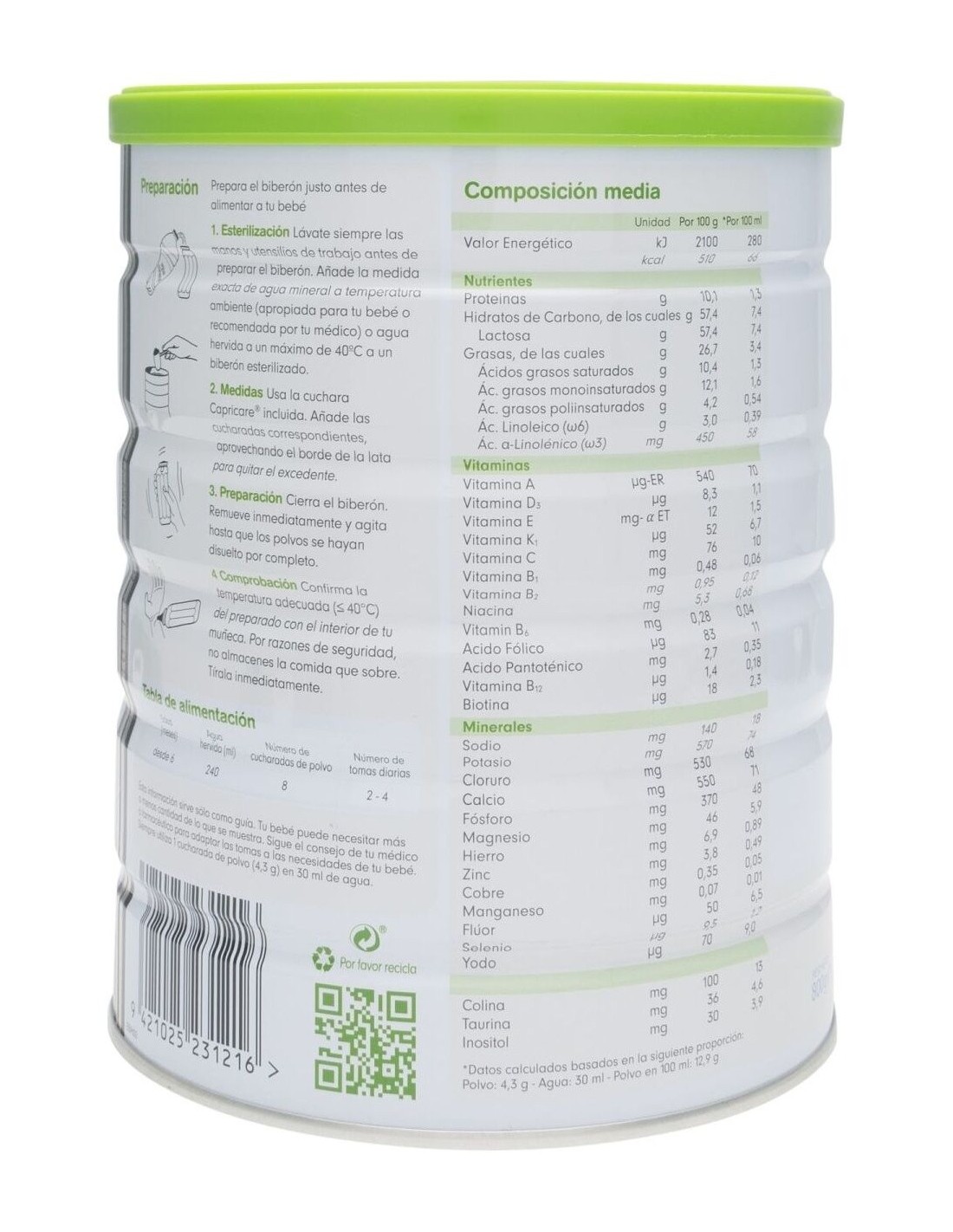 Basada en las propiedades naturalmente buenas de la leche de cabra, la fórmula de Capricare® aporta las vitaminas, los minerales y los nutrientes necesarios para complementar una dieta variada y equilibrada para el bebé. Es adecuada para la nutrición de los bebés de más de 6 meses.