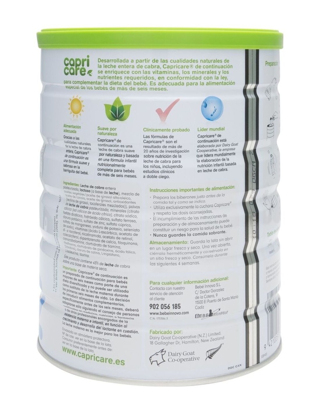 La leche materna es lo mejor para los bebés. \ La leche de continuación Capricare® es un preparado apto para bebés de más de seis meses. \ Debe formar parte de una dieta variada y no es sustitutiva de la leche materna durante los seis primeros meses de vida del bebé. \ La decisión de introducir alimentos complementarios, especialmente antes de los seis meses, solo debe tomarse siguiendo la recomendación del médico o profesional sanitario y según las necesidades de crecimiento y desarrollo del bebé.