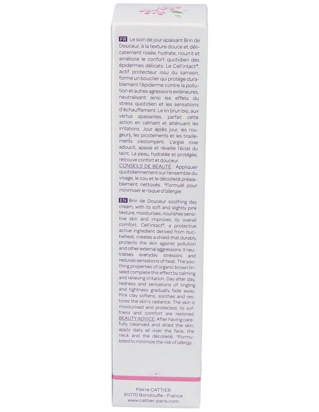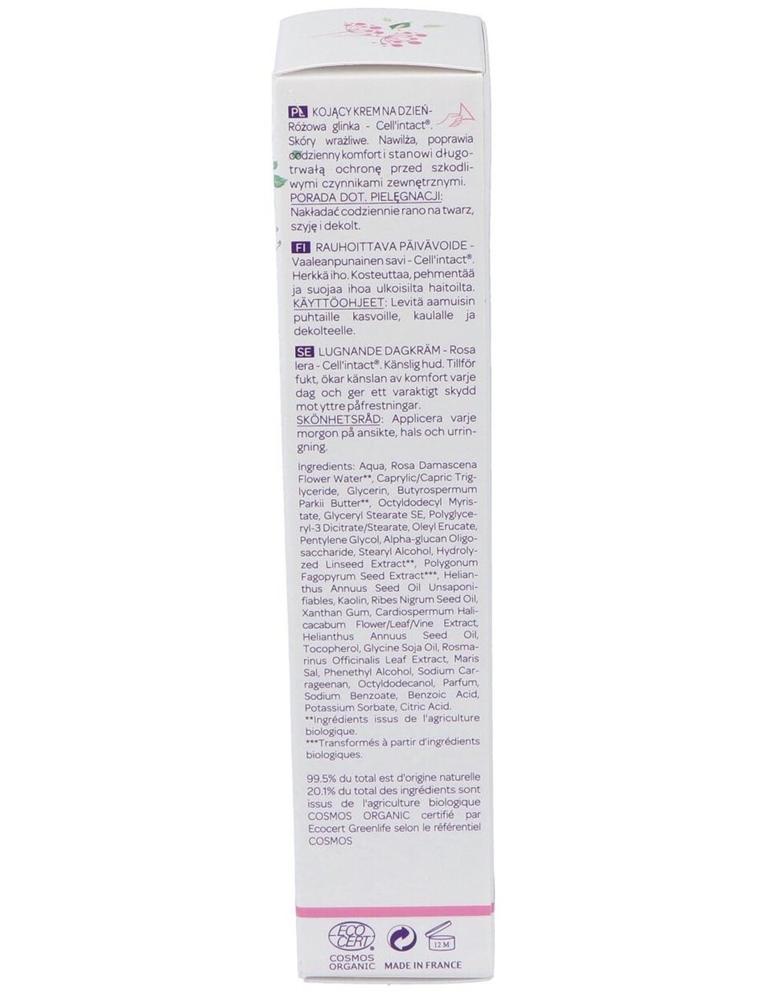 Hidrata y nutre la piel sensible y mejora su confort de forma global. CellIntact®, un ingrediente activo protector derivado del trigo sarraceno, crea un manto protector que protege la piel durante todo el día contra la polución y otras agresiones externas. Neutraliza los agentes que causan estrés a la piel y reduce la sensación de ardor. Las propiedades calmantes de la semilla de lino marrón ecológica completan el efecto calmando y aliviando las irritaciones. Día a día, las rojeces y la sensación de hormigueo y tirantez desaparecen gradualmente. La arcilla rosa suaviza, calma y devuelve a la piel su resplandor. La piel queda hidratada y protegida, y recupera la suavidad y la sensación de confort.