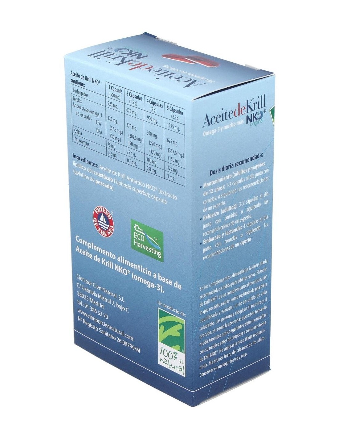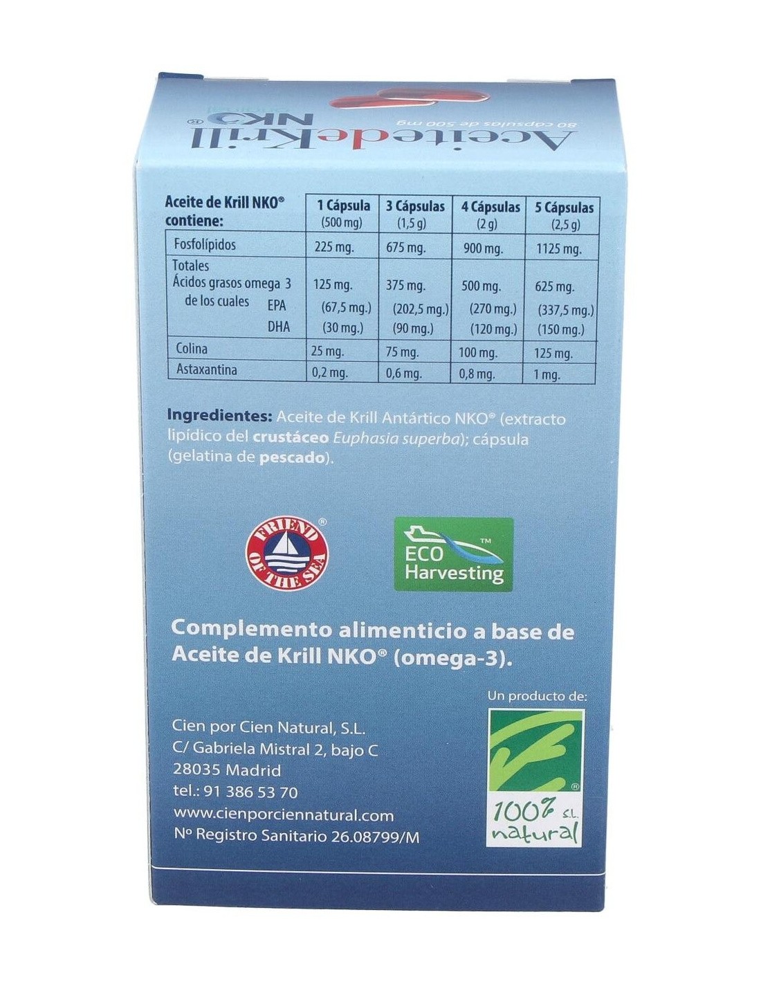 Aceite de kril antártico NKO (extracto lipídico del crustáceo), cápsula: gelatina de pescado.