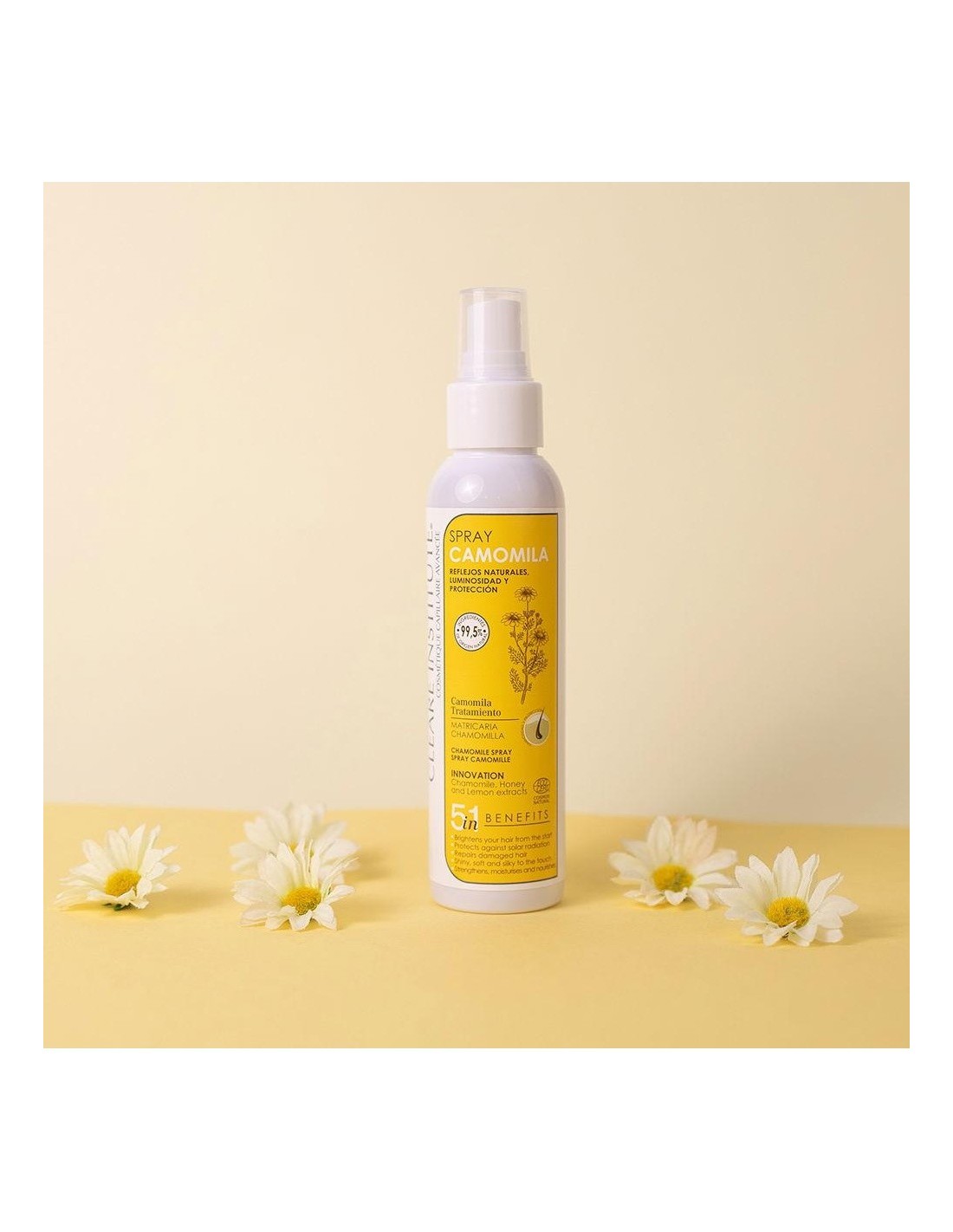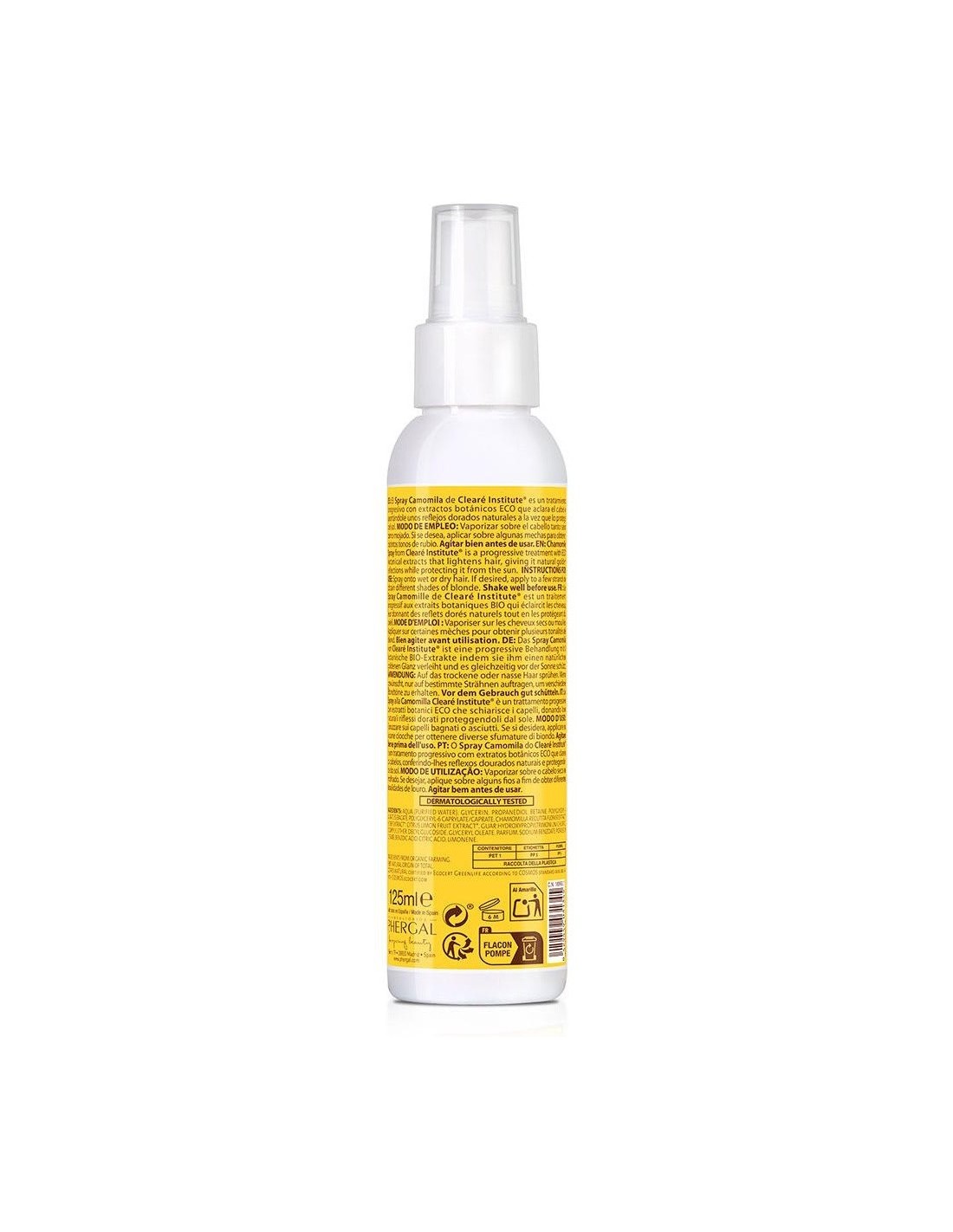 CLEARE INSTITUTELínea de tratamiento para cabellos rubios y castaños, que aclara e ilumina de forma progresiva el cabello consiguiendo unos bonitos reflejos dorados naturales. SPRAY camomila 125ml.