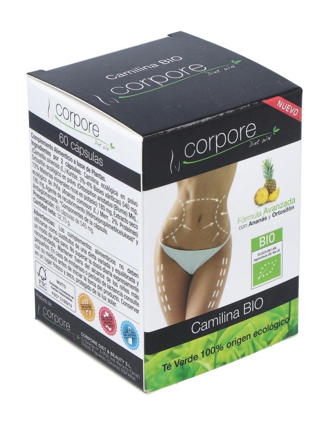 Esta exclusiva fórmula contiene ingredientes de origen 100% Ecológico, combinando Camilina BIO con Ananás BIO (Pulpa de Piña) y Extracto Seco de Ortosifón BIO (Té de Java). Presentada en cápsulas vegetales, aptas para Vegetarianos y Veganos, es un complemento ideal de ayuda para la pérdida de peso, y en especial para combatir la celulitis de las zonas más conflictivas de nuestro cuerpo como glúteos, vientre y muslos.
