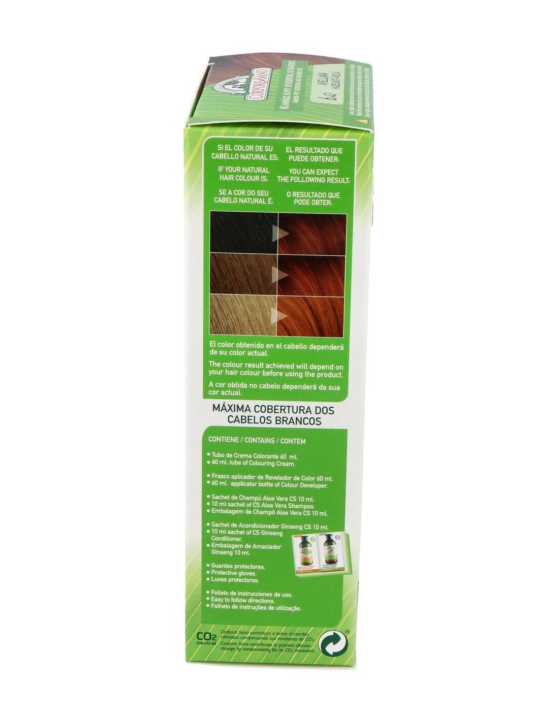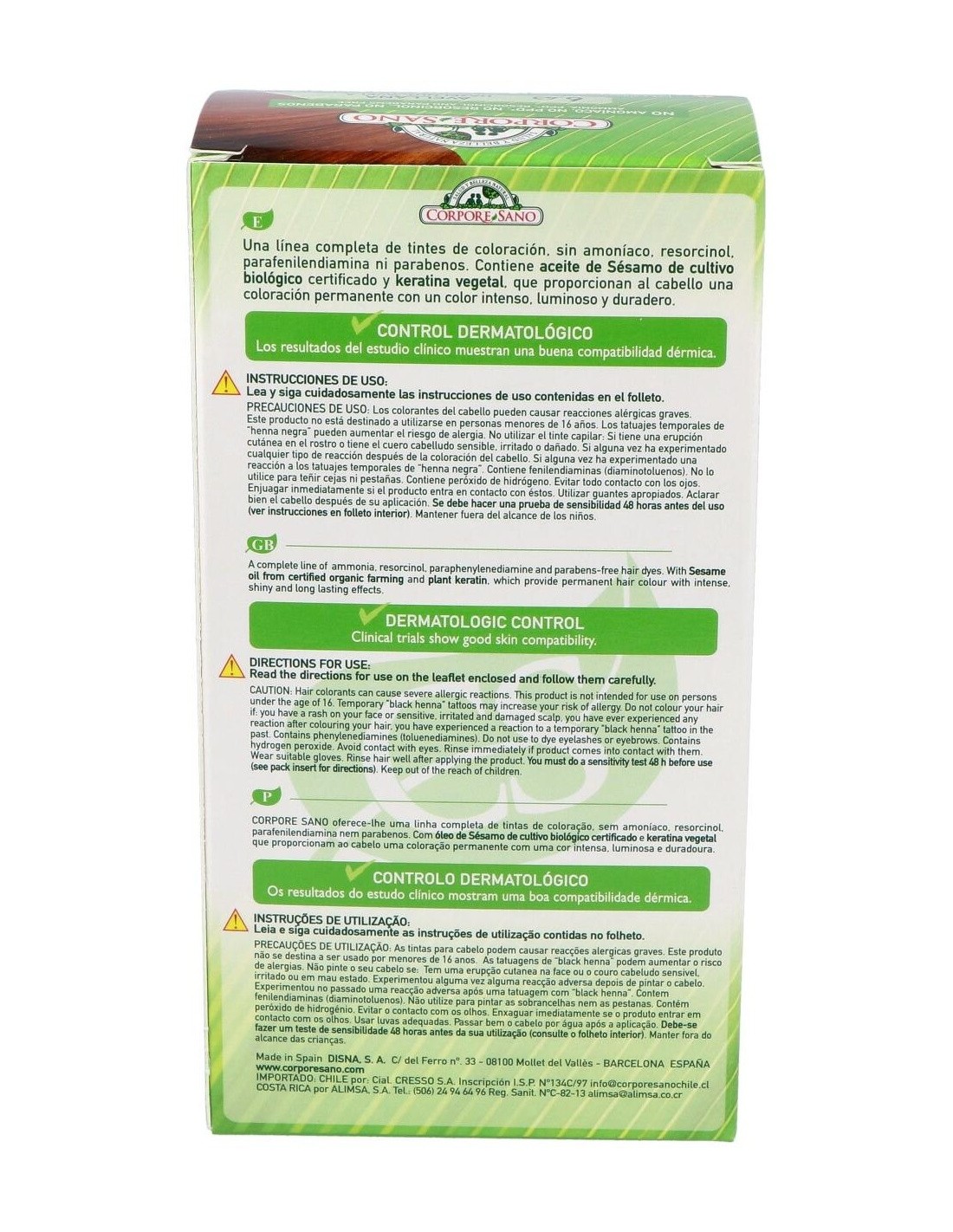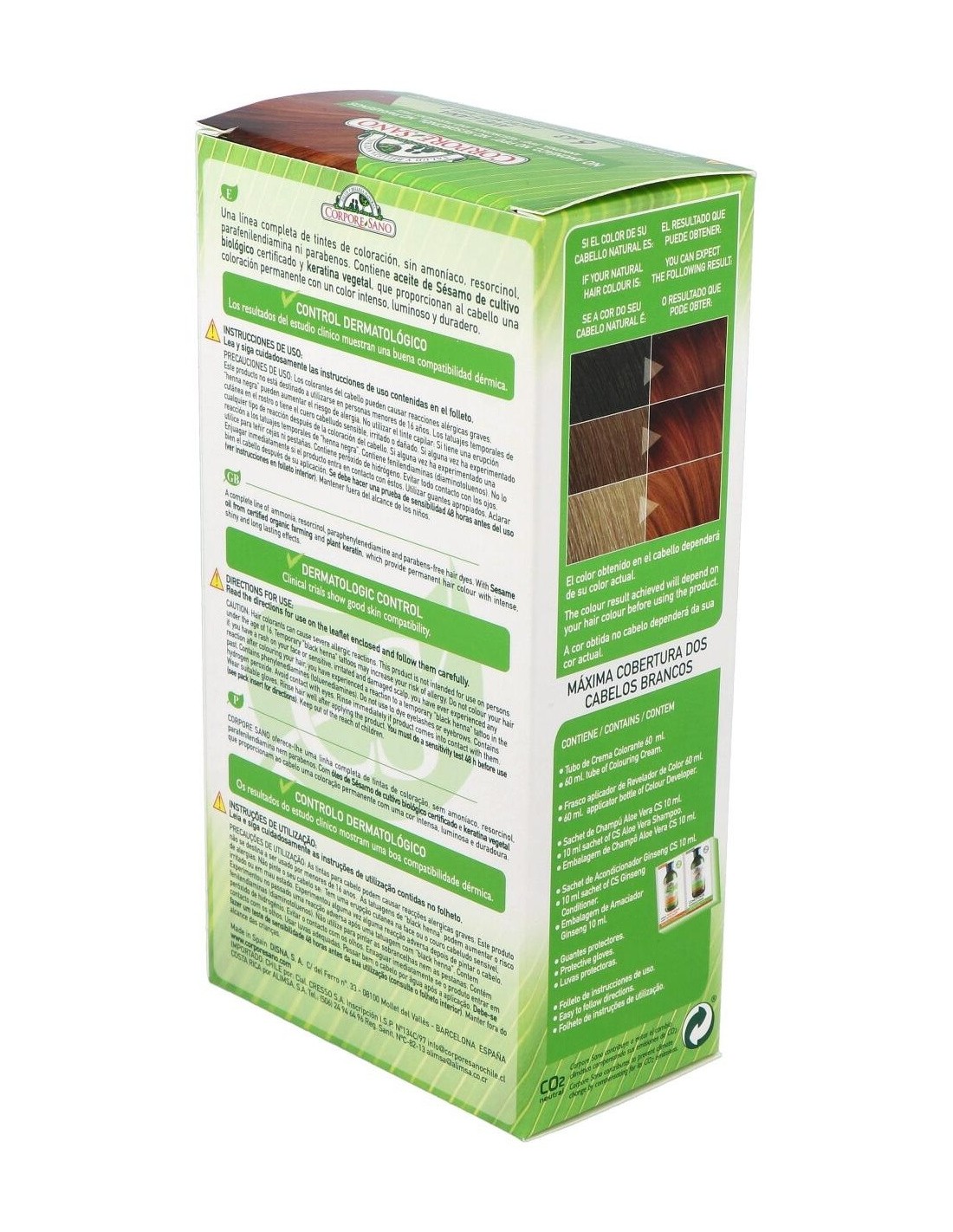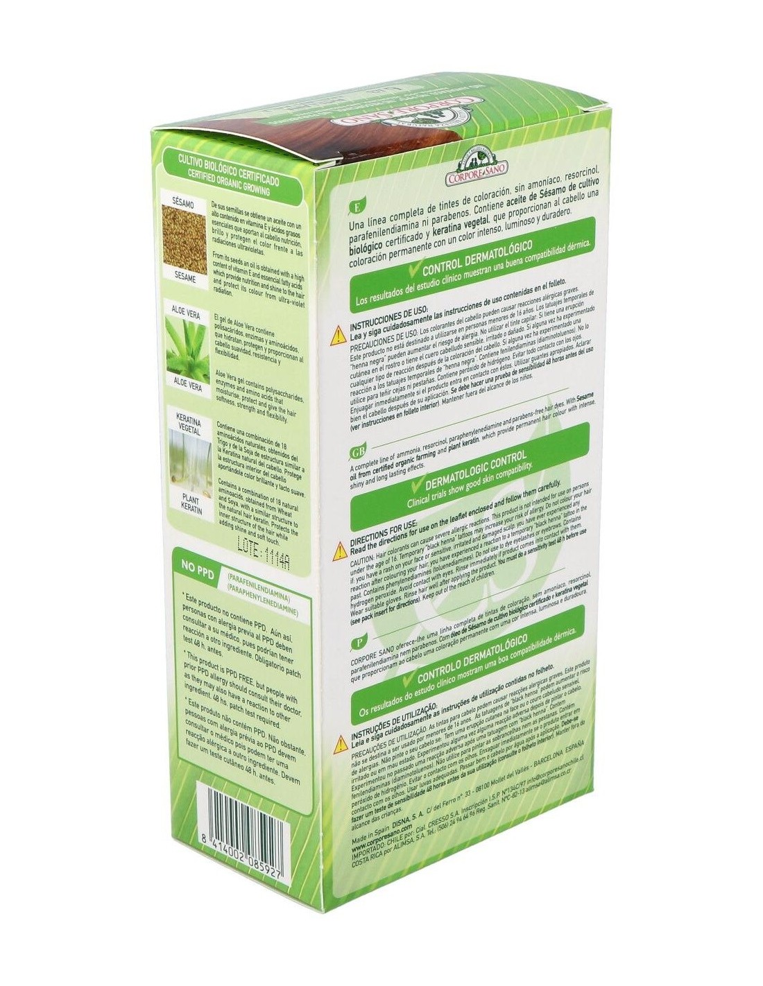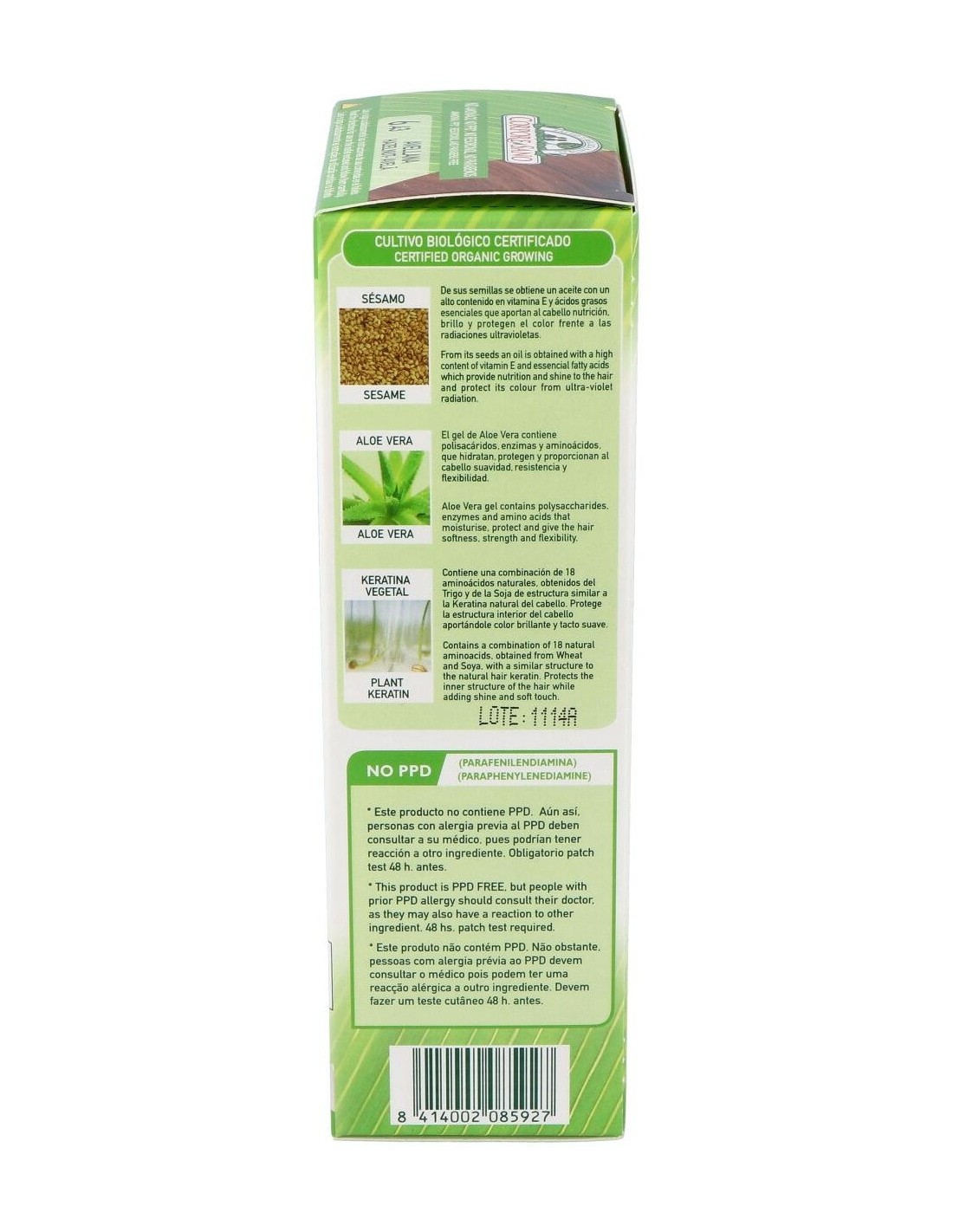 Aminoacids, Ethanolamine, Stearamide MEA, Ceteareth-60, Polyquaternium-6, Ethoxydiglycol oleate, Helianthus annuus seed oid bio, Sesamum indicum seed oil bio, Wheat aminoacids, Phenyltrimethicone, Sodium sulfite, Sodium ascorbate, Toluene, Diamine sulfate, Methylresorcinol, Aminophenol, Amino-4-hydroxyethylaminoanisole sulfate, Aloe Vera, Ethoxydiglycol, Threonine, Arginine, Betaine, Hexyl cinnamal, Cetrimonium chloride, Isopropyl myristate, Aqua, Limonene, Cetearyl Alcohol, Disodium EDTA, Serine, Parfum, Semillas de sésamo, Trigo / Trigo Harinero.