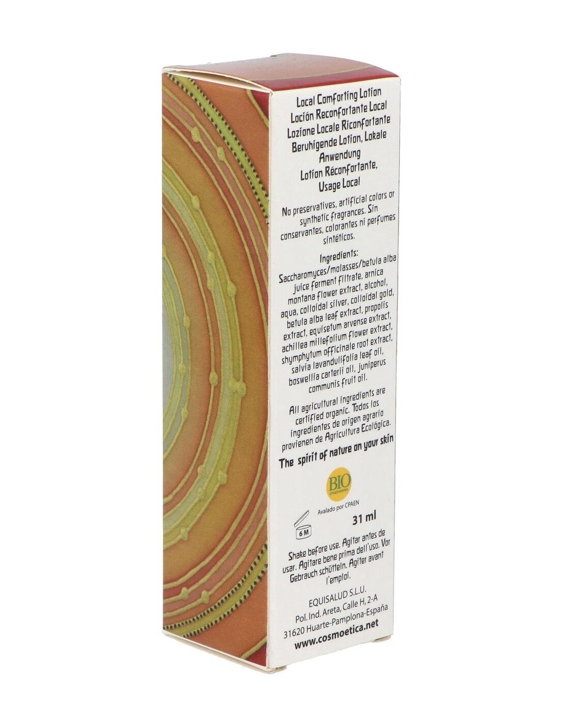 Saccharomyces/Molasses/Betula Alba Juice Ferment Filtrate*, Alcohol*, Aqua, Arnica Montana Flower Extract*, Colloidal Silver, Colloidal Gold, Betula Alba Leaf Extract*, Propolis Extract*, Equisetum Arvense Extract*, Achillea Millefolium Flower Extract*, Shymphytum Officinale Root Extract*, Salvia Officinalis Oil*, Boswellia Carterii Oil*, Juniperus Communis Fruit Oil*.