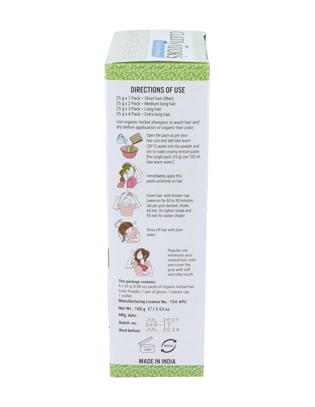 Lavar el cabello con un champú orgánico y secar antes de aplicar el tinte ecológico. Abrir el sobre o los sobres a utilizar según largo del pelo y volcar el contenido en un bol, agregar 100 ml de agua tibia (35ºC) por cada sobre. Mezclar hasta obtener una pasta homogénea. Aplicar de inmediato la pasta a tu cabello de manera uniforme. Cubrir todo el cabello con el gorro de plástico y dejar actuar el producto de 60 a 90 min según intensidad de color deseada (60 min para obtener un tono más claro y 90 min para la máxima intensidad de cada color). Aclarar muy bien el cabello con agua limpia.