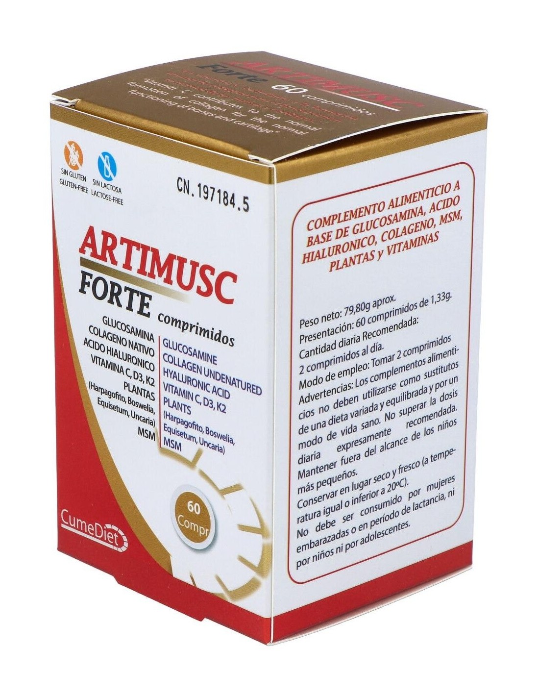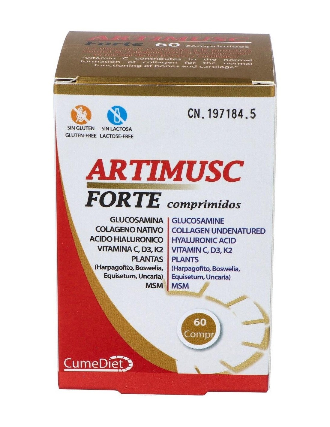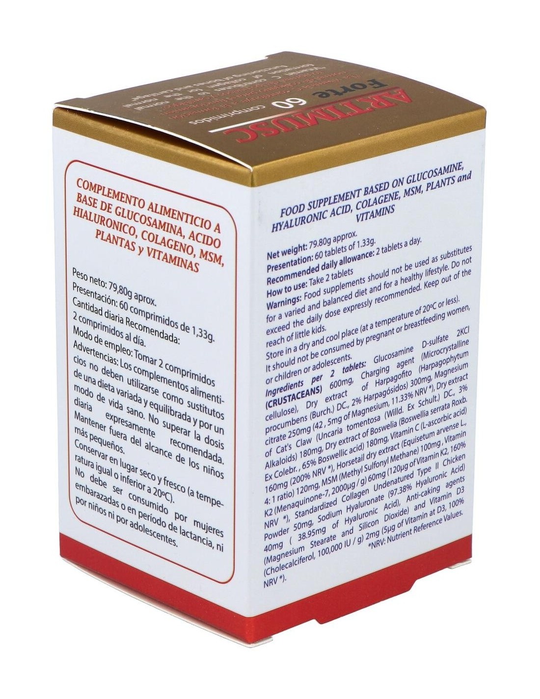 Glucosamina d-sulfato 2kcl (600 mg), Magnesio citrato (250 mg), Harpagofito extracto seco (2% harpagósidos)(300 mg), Vitamina C (ácido l ascórbico)(160 mg), Colágeno nativo tipo II (50 mg), Hialuronato sódico (40 mg), Cola de caballo extracto seco (equisetum arvensis)(120 mg), Uña de gato (Uncaria tormentosa)(180 mg), Boswellia serrata (180 mg), MSM polvo (100 mg), Vitamina K2 2000 ppm (60 mg), Vitamina D3 100,000 UI/g (2 mg), Celulosa microcristalina (agente de carga), Estearato de magnesio y dióxido de silicio (Antiaglomerantes).